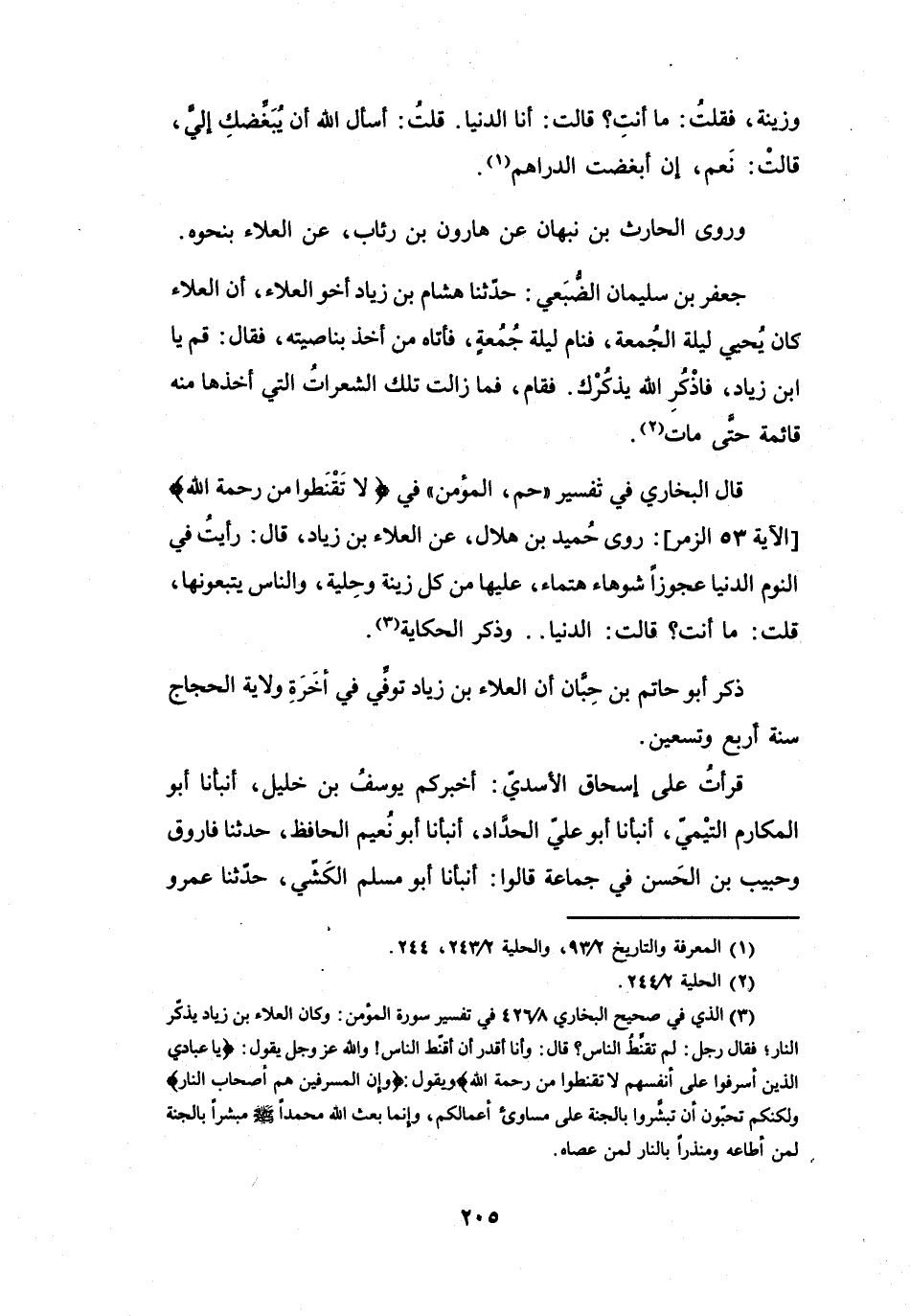 (3) الذي في صحيح البخاري 8 / 426 في تفسير سورة المؤمن: وكان العلاء بن زياد يذكر النار، فقال رجل: لم تقنط الناس؟ قال: وأنا أقدر أن أقنط الناس! والله عزوجل يقول: (يا عبادي الذين أسرفوا على أنفسهم لا تقنطوا من رحمة الله) ويقول: (وإن المسرفين هم أصحاب النار) ولكنكم تحبون أن تبشروا بالجنة على مساوئ أعمالكم، وإنما بعث الله محمدا صلى الله عليه وسلم مبشرا بالجنة لمن أطاعه ومنذرا بالنار لمن عصاه.