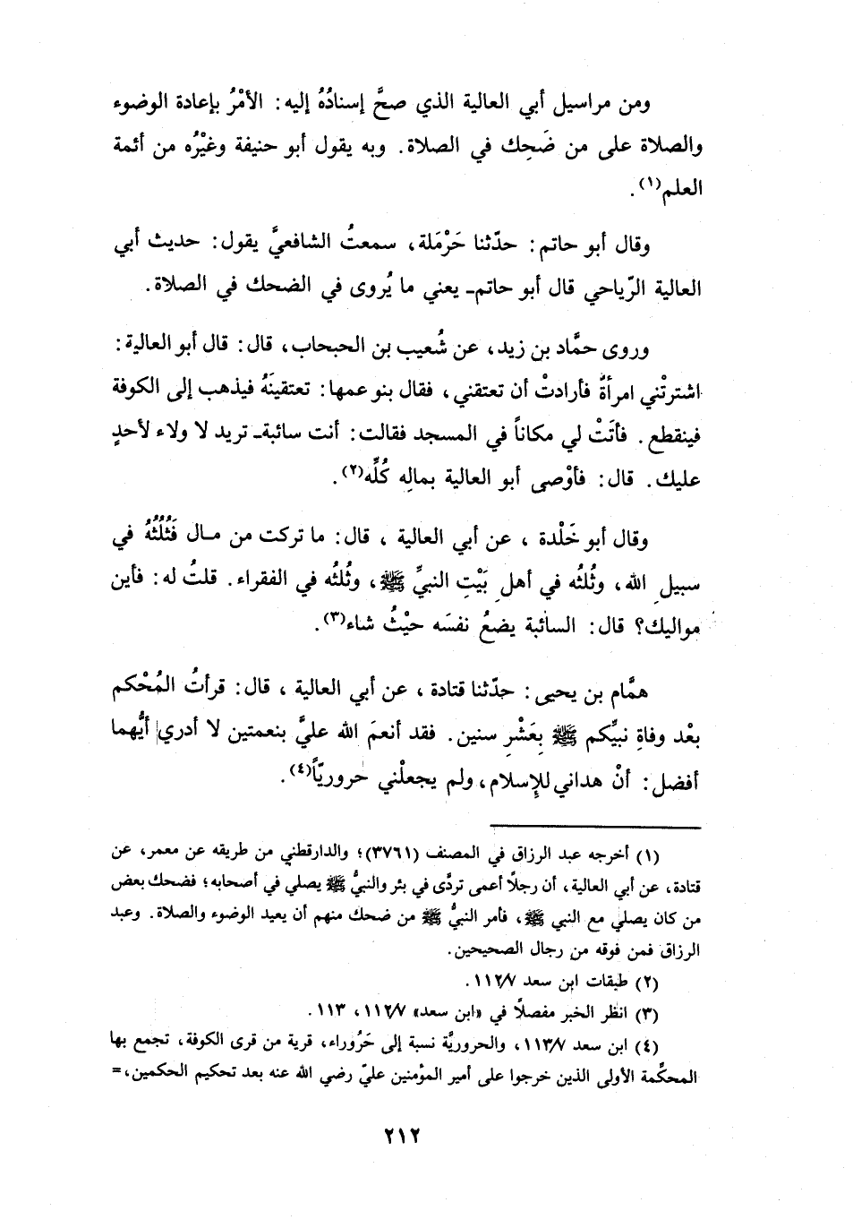 وَمِنْ مَرَاسِيْلِ أَبِي العَالِيَةِ الَّذِي صَحَّ إِسْنَادُهُ إِلَيْهِ: الأَمْرُ بِإِعَادَةِ الوُضُوْءِ، وَالصَّلاَةِ عَلَى مَنْ ضَحِكَ فِي الصَّلاَةِ.