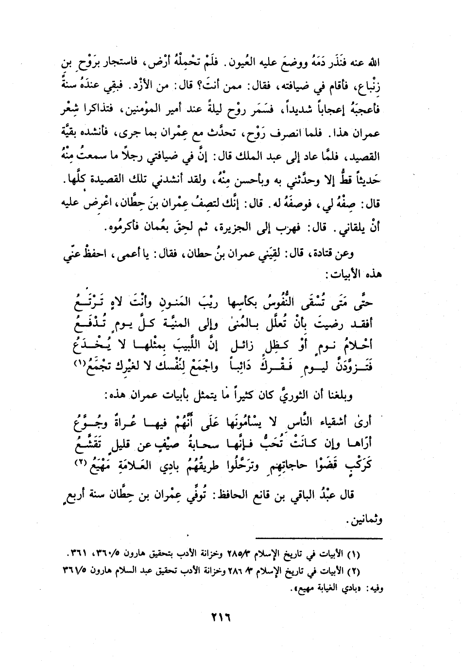 وَبَلَغَنَا أَنَّ الثَّوْرِيَّ كَانَ كَثِيْراً مَا يَتَمَثَّلُ بِأَبْيَاتِ عِمْرَانَ هَذِهِ: