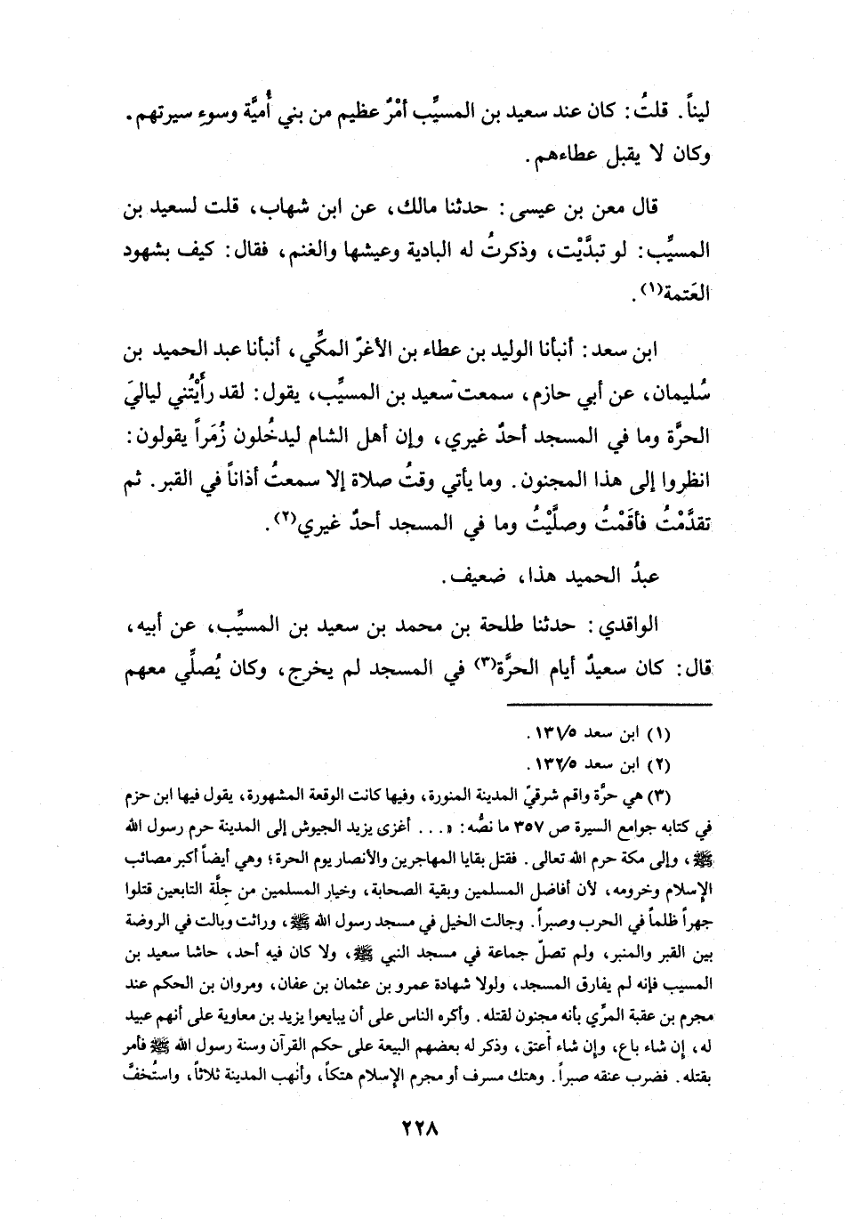 كَانَ سَعِيْدٌ أَيَّامَ الحَرَّةِ (3) فِي المَسْجِدِ لَمْ يَخْرُجْ، وَكَانَ يُصَلِّي مَعَهُمُ