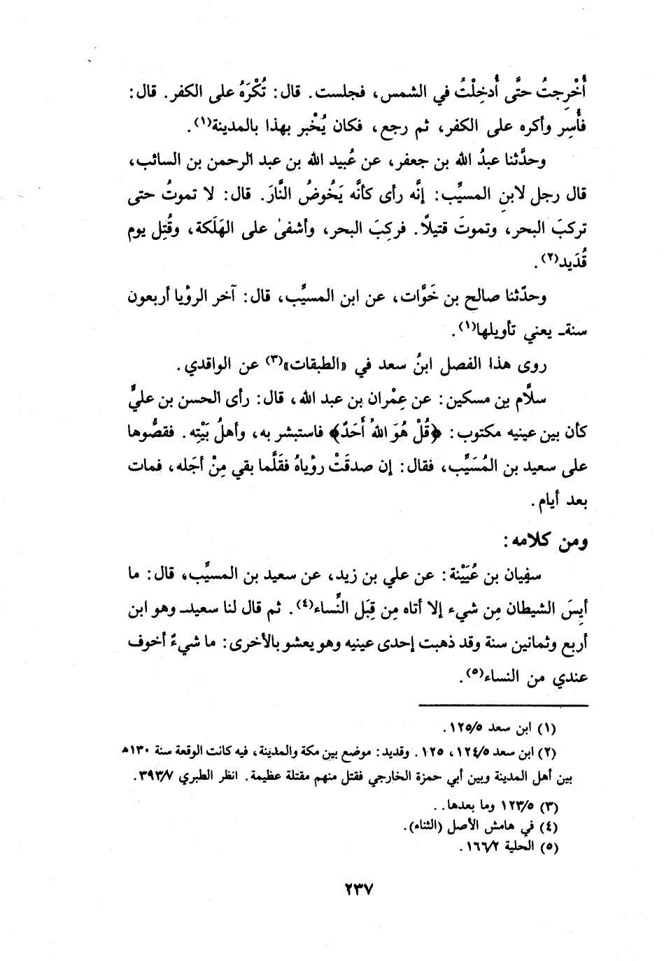 ثُمَّ قَالَ لَنَا سَعِيْدٌ - وَهُوَ ابْنُ أَرْبَعٍ وَثَمَانِيْنَ سَنَةً، وَقَدْ ذَهَبَتْ إِحْدَى عَيْنَيْهِ، وَهُوَ يَعْشُو بِالأُخْرَى -: مَا شَيْءٌ أَخَوْفُ عِنْدِي مِنَ النِّسَاءِ (5) .