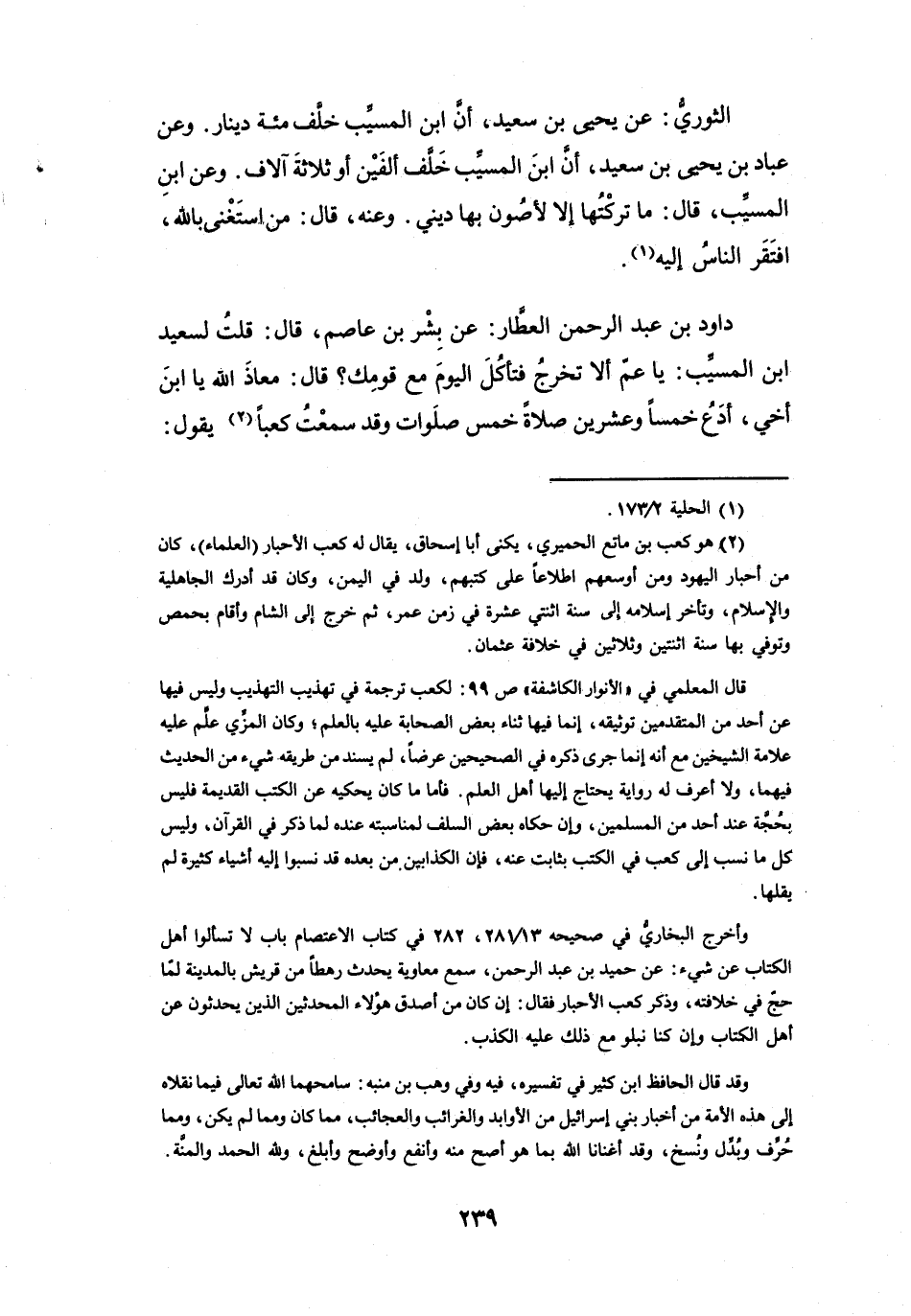 (2) هو كعب بن ماتع الحميري، يكنى أبا إسحاق، يقال له كعب الأحبار (العلماء) ، كان من أحبار اليهود ومن أوسعهم اطلاعا على كتبهم، ولد في اليمن، وكان قد أدرك الجاهلية والاسلام، وتأخر إسلامه إلى سنة اثنتي عشرة في زمن عمر، ثم خرج إلى الشام وأقام بحمص وتوفي بها سنة اثنتين وثلاثين في خلافة عثمان.