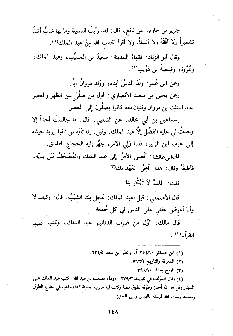 قَالَ مَالِكٌ: أَوَّلُ مَنْ ضَرَبَ الدَّنَانِيْرَ عَبْدُ المَلِكِ، وَكَتَبَ عَلَيْهَا القُرْآنَ (4) .
