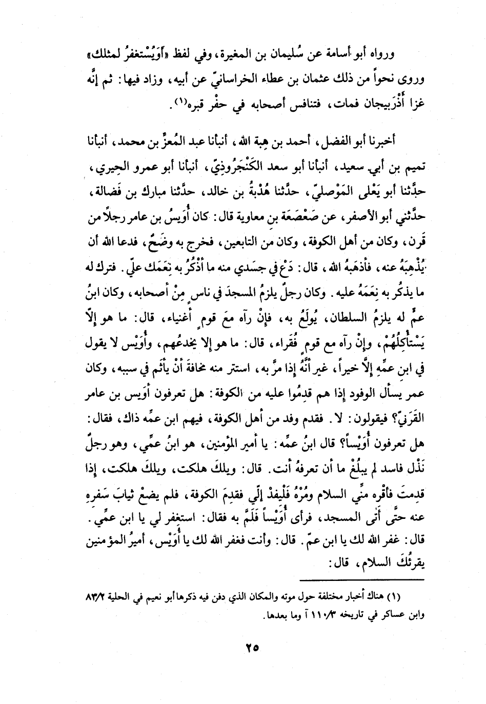 وَكَانَ عُمَرُ يَسْأَلُ الوُفُوْدَ إِذَا هُم قَدِمُوا عَلَيْهِ مِنَ الكُوْفَةِ: هَلْ تَعْرِفُوْنَ أُوَيْسَ بنَ عَامِرٍ القَرَنِيَّ؟