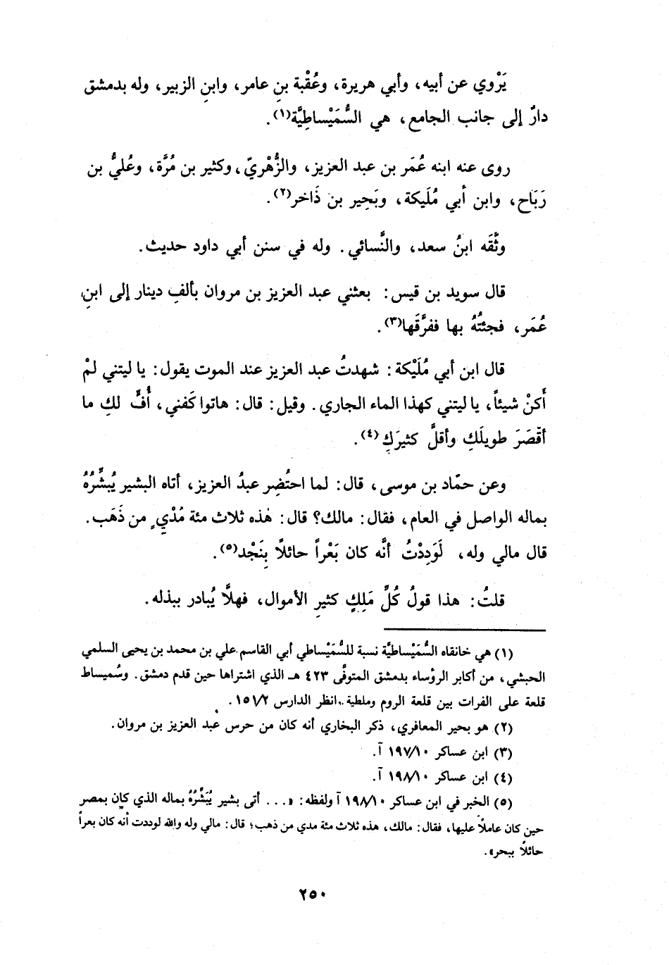(5) الخبر في ابن عساكر 10 / 198 آولفظه: "..أتى بشير يبشره بماله الذي كان بمصر حين كان عاملا عليها، فقال: مالك، هذه ثلاث مئة مدي من ذهب، قال: مالي وله والله لوددت أنه كان بعرا حائلا ببحر ".