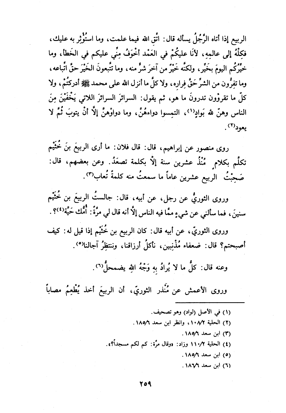 جَالَسْتُ الرَّبِيْعَ بنَ خُثَيْمٍ سِنِيْنَ، فَمَا سَأَلَنِي عَنْ شَيْءٍ مِمَّا فِيْهِ النَّاسُ، إِلاَّ أَنَّهُ قَالَ لِي مَرَّةً: أُمُّكَ حَيَّةٌ (4) ؟