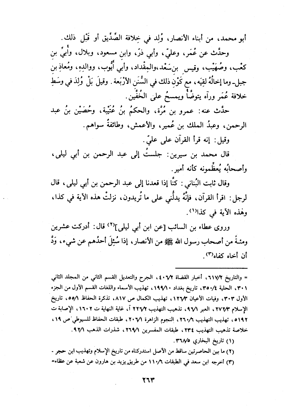 قَالَ مُحَمَّدُ بنُ سِيْرِيْنَ: جَلَسْتُ إِلَى عَبْدِ الرَّحْمَنِ بنِ أَبِي لَيْلَى، وَأَصْحَابُهُ يُعَظِّمُوْنَهُ، كَأَنَّهُ أَمِيْرٌ.