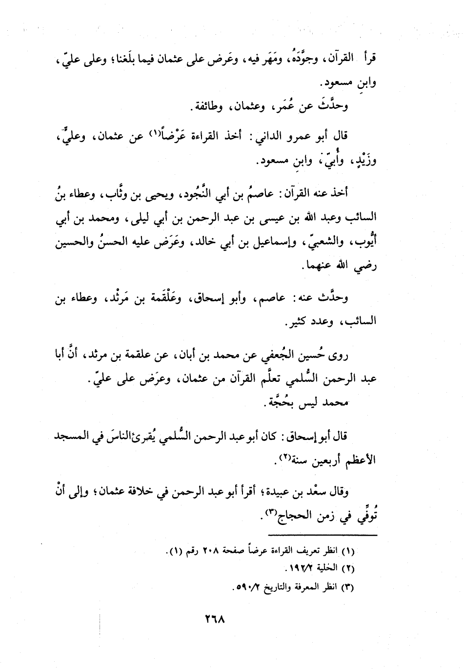 أَنَّ أَبَا عَبْدِ الرَّحْمَنِ السُّلَمِيَّ تَعَلَّمَ القُرْآنَ مِنْ عُثْمَانَ، وَعَرَضَ عَلَى عَلِيٍّ.