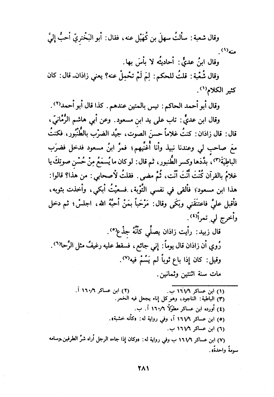 قَالَ زَاذَانُ: كُنْتُ غُلاَماً حَسَنَ الصَّوْتِ، جَيِّدَ الضَّرْبِ بِالطُّنْبُوْرِ، فَكُنْتُ مَعَ صَاحِبٍ لِي، وَعِنْدَنَا نَبِيْذٌ، وَأَنَا أُغَنِّيْهِمْ، فَمَرَّ ابْنُ مَسْعُوْدٍ، فَدَخَلَ، فَضَرَبَ البَاطِيَةَ (3) ، بَدَّدَهَا، وَكَسَرَ الطُّنْبُوْرَ، ثُمَّ قَالَ: لَوْ كَانَ مَا يُسْمَعُ مِنْ حُسْنِ صَوْتِكَ يَا غُلاَمُ بِالقُرْآنِ، كُنْتَ أَنْتَ أَنْتَ.
