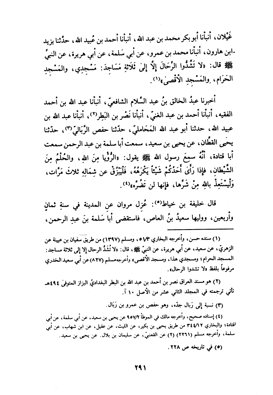 أَخْبَرَنَا عَبْدُ الخَالِقِ بنُ عَبْدِ السَّلاَمِ الشَّافِعِيُّ، أَنْبَأَنَا عَبْدُ اللهِ بنُ أَحْمَدَ الفَقِيْهُ، أَنْبَأَنَا أَحْمَدُ بنُ عَبْدِ الغَنِيِّ، أَنْبَأَنَا نَصْرُ بنُ البَطِرِ (2) ، أَنْبَأَنَا عَبْدُ اللهِ بنُ عُبَيْدِ اللهِ، حَدَّثَنَا أَبُو عَبْدِ اللهِ المَحَامِلِيُّ، حَدَّثَنَا حَفْصٌ الرَّبَالِيُّ (3) ، حَدَّثَنَا يَحْيَى القَطَّانُ، عَنْ يَحْيَى بنِ سَعِيْدٍ، سَمِعْتُ أَبَا سَلَمَةَ بنَ عَبْدِ الرَّحْمَنِ، سَمِعْتُ أَبَا قَتَادَةَ: