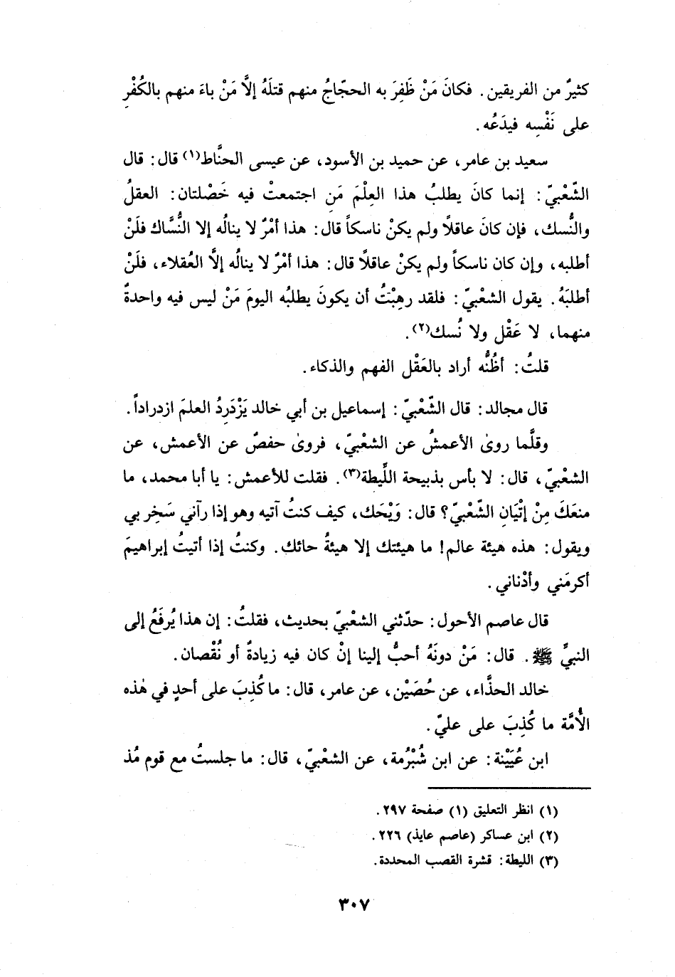 يَقُوْلُ الشَّعْبِيُّ: فَلَقَدْ رَهِبْتُ أَنْ يَكُوْنَ يَطْلُبُهُ اليَوْمَ مِنْ لَيْسَ فِيْهِ وَاحِدَةٌ مِنْهُمَا، لاَ عَقْلَ وَلاَ نُسْكَ (2) .