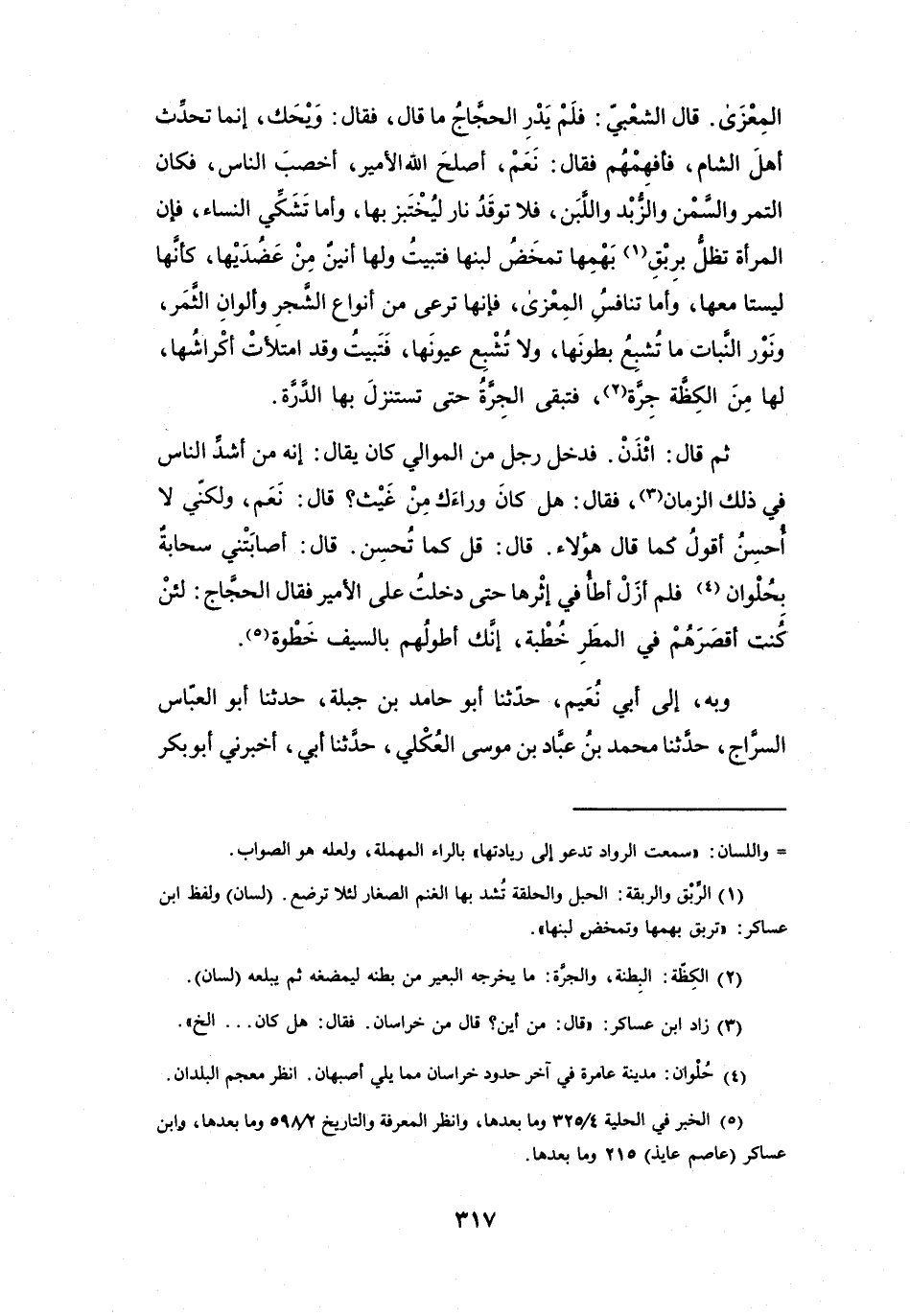 فَقَالَ: نَعَمْ، أَصْلَحَ اللهُ الأَمِيْرَ، أَخْصَبَ النَّاسُ، فَكَانَ التَّمْرُ، وَالسَّمْنُ، وَالزُّبْدُ، وَاللَّبَنُ، فَلاَ تُوْقَدُ نَارٌ لِيُخْتَبَزَ بِهَا، وَأَمَّا تَشَكِّي النِّسَاءِ، فَإِنَّ المَرْأَةَ تَظَلُّ بِرِبْقِ (1) بَهْمِهَا تَمْخَضُ لَبَنَهَا، فَتَبِيْتُ وَلَهَا أَنِيْنٌ مِنْ عَضُدَيْهَا، كَأَنَّهَا لَيْسَتَا مَعَهَا، وَأَمَّا تَنَافُسُ المِعْزَى، فَإِنَّهَا تَرْعَى مِنْ أَنْوَاعِ الشَّجَرِ، وَأَلْوَانِ الثَّمَرِ، وَنَوْرِ النَّبَاتِ مَا تُشْبِعُ بُطُوْنَهَا، وَلاَ تُشْبِعُ عُيُوْنَهَا، فَتَبِيْتُ وَقَدِ امْتَلأَتْ أَكْرَاشُهَا، لَهَا مِنَ الكَظَّةِ جِرَّةٌ (2) ، فَتَبْقَى الجِرَّةُ حَتَّى تَسْتَنْزِلَ بِهَا الدَّرَّةَ.