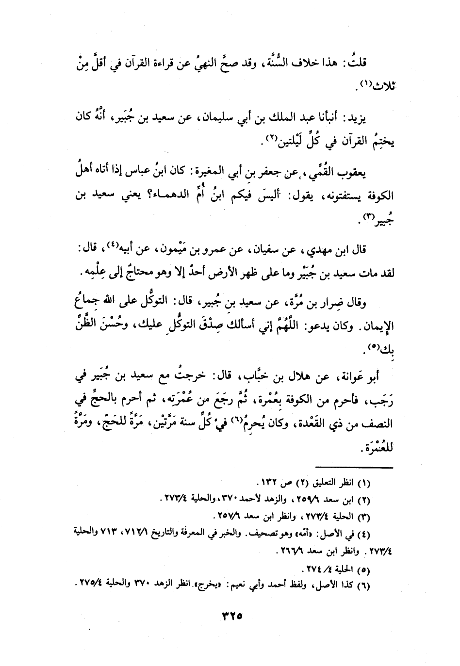 خَرَجْتُ مَعَ سَعِيْدِ بنِ جُبَيْرٍ فِي رَجَبٍ، فَأَحْرَمَ مِنَ الكُوْفَةِ بِعُمْرَةٍ، ثُمَّ رَجَعَ مِنْ عُمْرَتِهِ، ثُمَّ أَحْرَمَ بِالحَجِّ فِي النِّصْفِ مِنْ ذِي القَعْدَةِ، وَكَانَ يُحْرِمُ (6) فِي كُلِّ سَنَةٍ مَرَّتَيْنِ؛ مَرَّةً لِلْحَجِّ، وَمَرَّةً لِلْعُمْرَةِ.