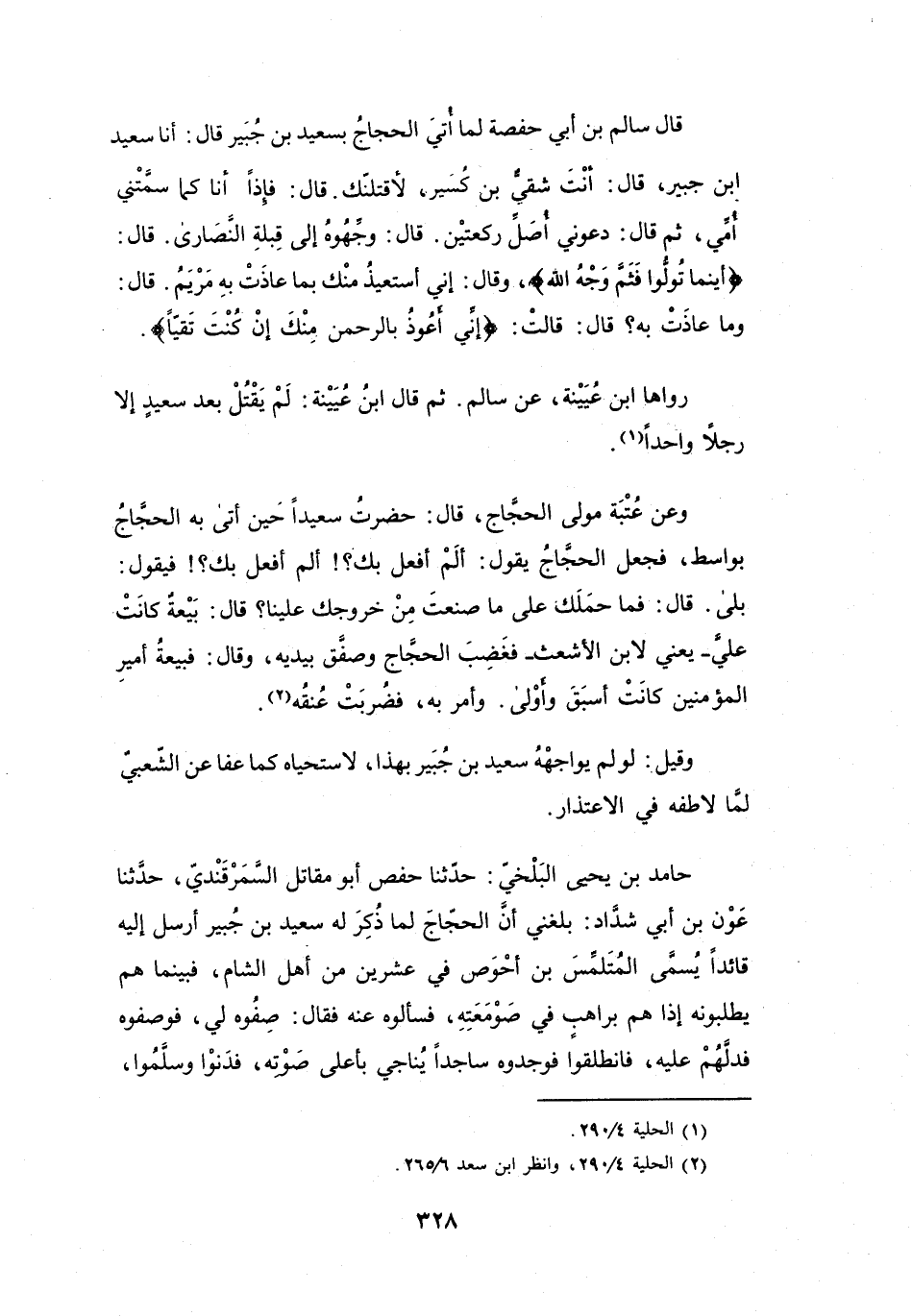 حَضَرْتُ سَعِيْداً حِيْنَ أَتَى بِهِ الحَجَّاجُ بِوَاسِطَ، فَجَعَلَ الحَجَّاجُ يَقُوْلُ: أَلَمْ أَفْعَلْ بِكَ؟! أَلَمْ أَفْعَلْ بِكَ؟!