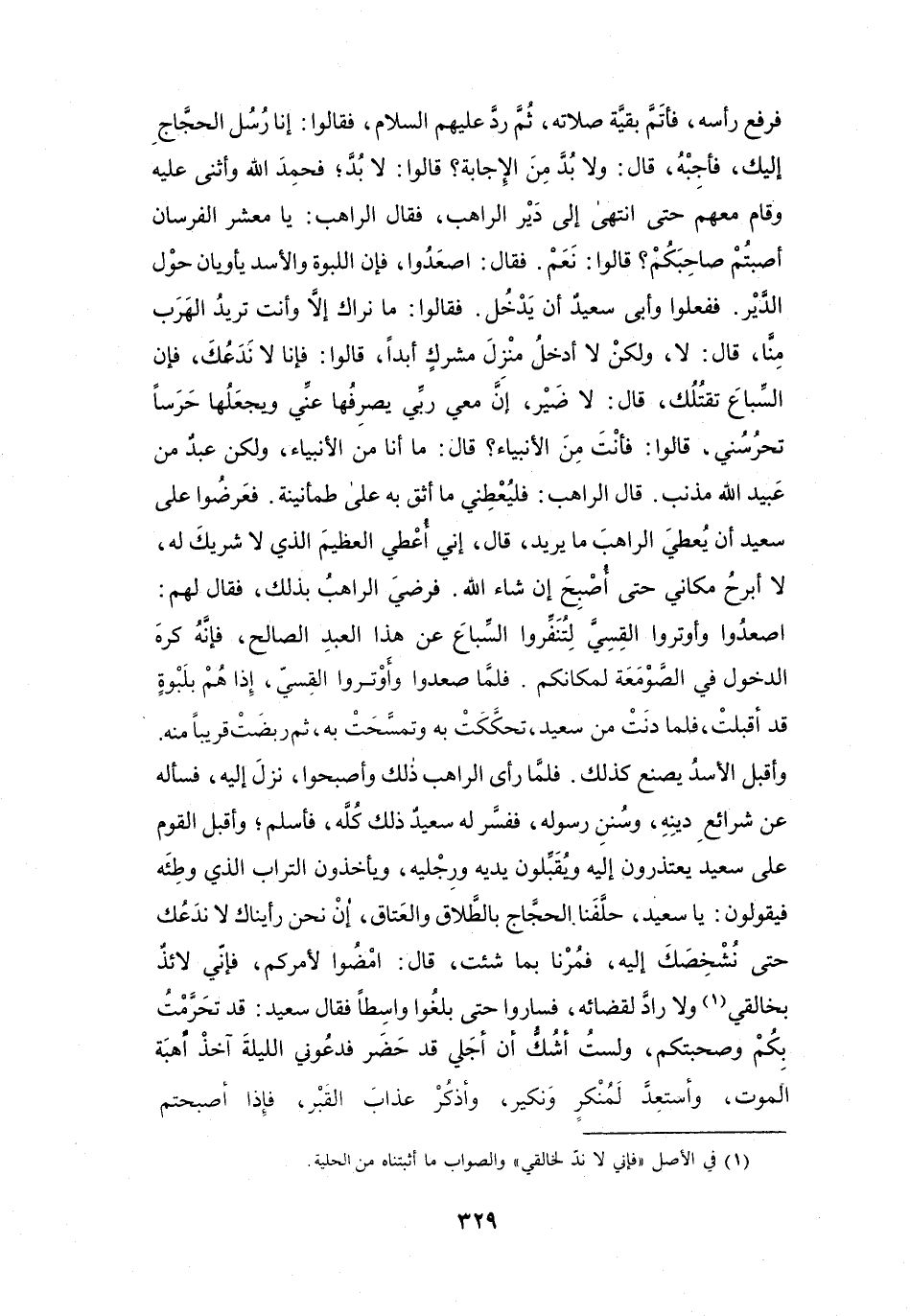 فَلَمَّا رَأَى الرَّاهِبُ ذَلِكَ، وَأَصْبَحُوا، نَزَلَ إِلَيْهِ، فَسَأَلَهُ عَنْ شَرَائِعِ دِيْنِهِ، وَسُنَنِ رَسُوْلِهِ، فَفَسَّرَ لَهُ سَعِيْدٌ ذَلِكَ كُلَّهُ، فَأَسْلَمَ، وَأَقْبَلَ القَوْمُ عَلَى سَعِيْدٍ يَعْتَذِرُوْنَ إِلَيْهِ، وَيُقَبِّلُوْنَ يَدَيْهِ وَرِجْلَيْهِ، وَيَأْخُذُوْنَ التُّرَابَ الَّذِي وَطِئَهُ، فَيَقُوْلُوْنَ: يَا سَعِيْدُ، حَلَّفَنَا الحَجَّاجُ بِالطَّلاَقِ وَالعَتَاقِ، إِنْ نَحْنُ رَأَيْنَاكَ لاَ نَدَعُكَ حَتَّى نُشْخِصَكَ إِلَيْهِ، فَمُرْنَا بِمَا شِئْتَ.
