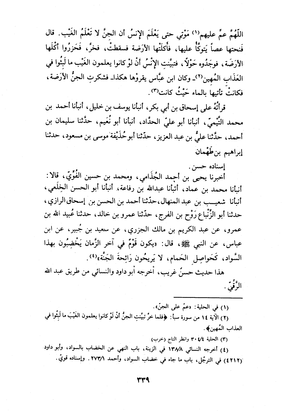 قَالَ: فَنَحَتَهَا عَصاً يَتَوَكَّأُ عَلَيْهَا، فَأَكَلَتْهَا الأَرَضَةُ، فَسَقَطَتْ، فَخَرَّ، فَحَزِرُوْا أَكْلَهَا الأَرَضَةَ، فَوَجَدُوْهُ حَوْلاً، فَتَبَيَّنَتِ الإِنْسُ أَنْ لَوْ كَانُوا يَعْلَمُوْنَ الغَيْبَ مَا لَبِثُوا فِي العَذَابِ المَهِيْنِ (2) - وَكَانَ ابْنُ عَبَّاسٍ يَقْرَؤُهَا هَكَذَا - فَشَكَرَتِ الجِنُّ الأَرَضَةَ، فَكَانَتْ تَأْتِيْهَا بِالمَاءِ حَيْثُ كَانَتْ (3) .