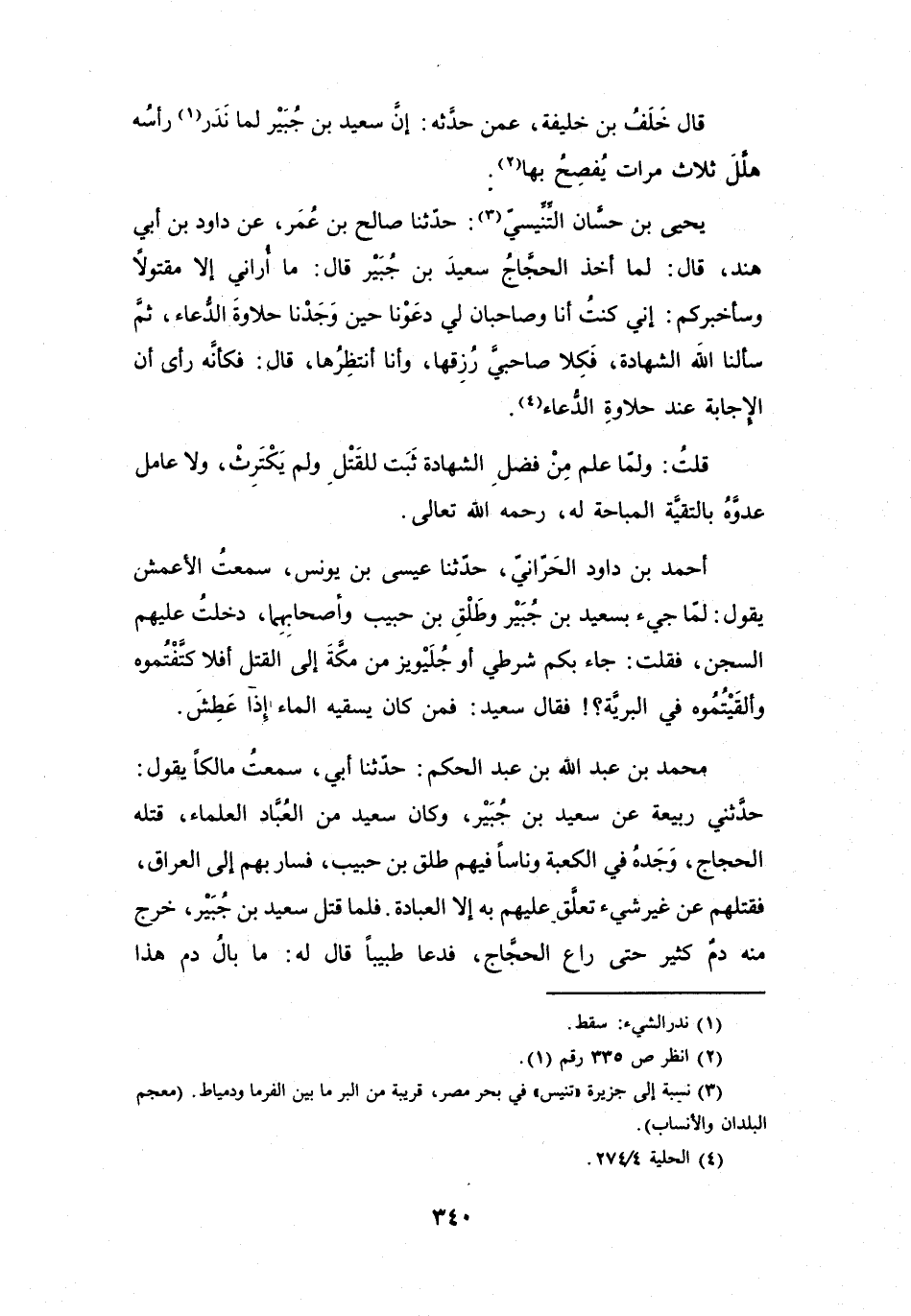 حَدَّثَنِي رَبِيْعَةُ، عَنْ سَعِيْدِ بنِ جُبَيْرٍ: وَكَانَ سَعِيْدٌ مِنَ العُبَّادِ العُلَمَاءِ، قَتَلَهُ الحَجَّاجُ، وَجَدَهُ فِي الكَعْبَةِ وَنَاساً فِيْهِم طَلْقُ بنُ حَبِيْبٍ، فَسَارِ بِهِم إِلَى العِرَاقِ، فَقَتَلَهُمْ عَنْ غَيْرِ شَيْءٍ تَعَلَّقَ عَلَيْهِمْ بِهِ إِلاَّ العِبَادَةَ، فَلَمَّا قُتِلَ سَعِيْدُ بنُ جُبَيْرٍ، خَرَجَ مِنْهُ دَمٌ كَثِيْرٌ حَتَّى رَاعَ الحَجَّاجَ، فَدَعَا طَبِيْباً، قَالَ لَهُ: مَا بَالُ دَمِ هَذَا