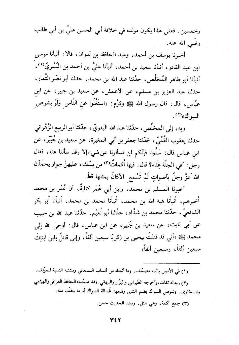 أَنْبَأَنَا مُوْسَى بنُ عَبْدِ القَادِرِ، أَنْبَأَنَا سَعِيْدُ بنُ أَحْمَدَ، أَنْبَأَنَا عَلِيُّ بنُ أَحْمَدَ بنِ البُسْرِيِّ (1) ، أَنْبَأَنَا أَبُو طَاهِرٍ المُخَلِّصُ، حَدَّثَنَا عَبْدُ اللهِ بنُ مُحَمَّدٍ، حَدَّثَنَا أَبُو نَصْرٍ التَّمَّارُ، حَدَّثَنَا عَبْدُ العَزِيْزِ بنُ مُسْلِمٍ، عَنِ الأَعْمَشِ، عَنْ سَعِيْدِ بنِ جُبَيْرٍ، عَنِ ابْنِ عَبَّاسٍ، قَالَ: