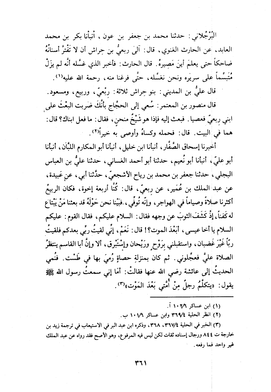 (3) الخبر في الحلية 4 / 367، 368، وذكره ابن عبد البر في الاستيعاب في ترجمة زيد بن خارجة ت 844 ورجال إسناده ثقات لكن ليس فيه المرفوع، وهو الاصح فقد رواه عن عبد الملك غير واحد فما رفعه.