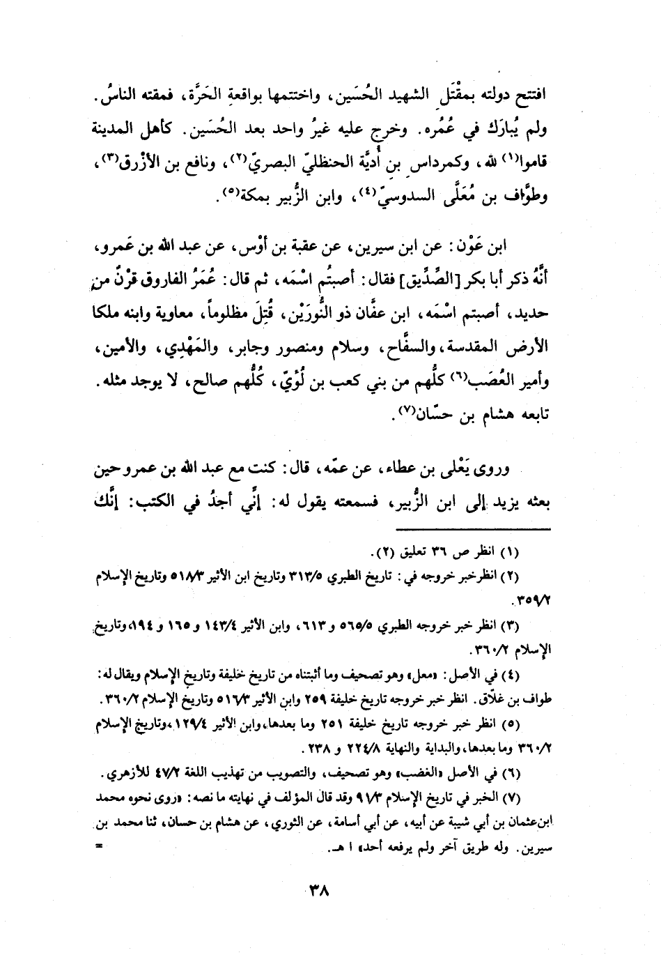 (7) الخبر في تاريخ الإسلام 3 / 91 وقد قال المؤلف في نهايته ما نصه: " روى نحوه محمد ابن عثمان بن أبي شيبة عن أبيه، عن أبي سامة، عن الثوري، عن هشام بن حسان، ثنا محمد بن سيرين.