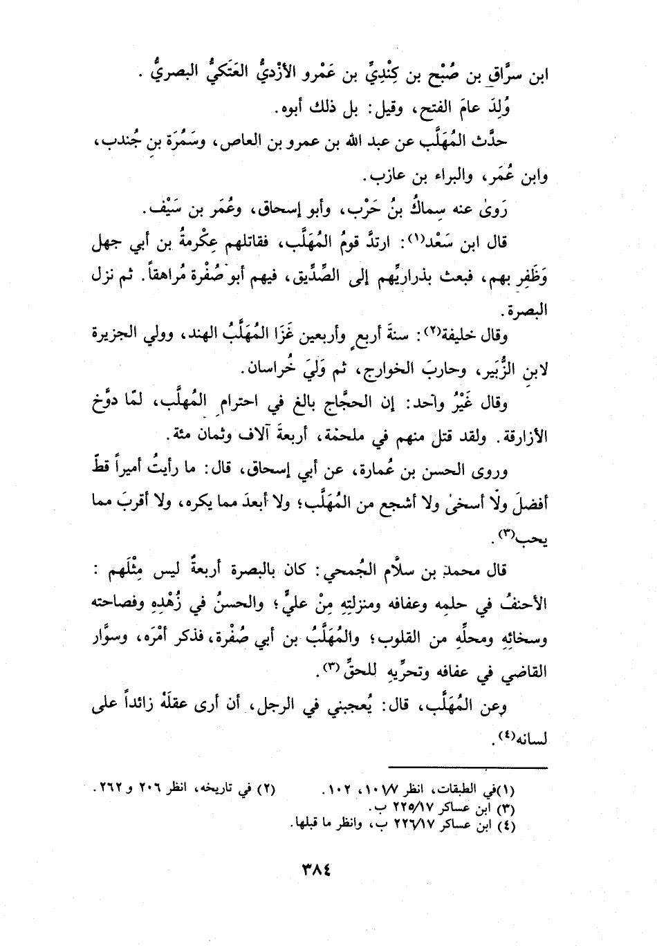 الأَحْنَفُ: فِي حِلْمِهِ، وَعَفَافِهِ، وَمَنْزِلَتِهِ مِنْ عَلِيٍّ، وَالحَسَنُ: فِي زُهْدِهِ، وَفَصَاحْتِهِ، وَسَخَائِهِ، وَمَحَلِّهِ مِنَ القُلُوْبِ، وَالمُهَلَّبُ بنُ أَبِي صُفْرَةَ: ... فَذَكَرَ أَمْرَهُ، وَسَوَّارٌ القَاضِي: فِي عَفَافِهِ، وَتَحَرِّيْهِ لِلْحَقٍّ (3) .