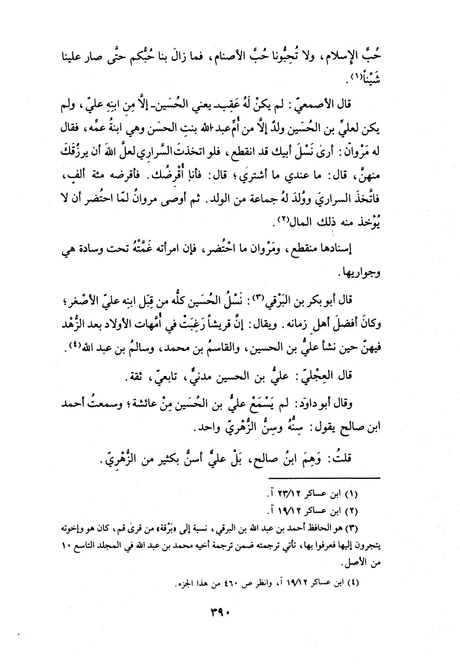 قَالَ أَبُو بَكْرٍ بنُ البَرْقِيِّ (3) : نَسْلُ الحُسَيْنِ كُلُّهُ مِنْ قِبَلِ ابْنِهِ عَلِيٍّ الأَصْغَرِ، وَكَانَ أَفَضْلَ أَهْلِ زَمَانِهِ.