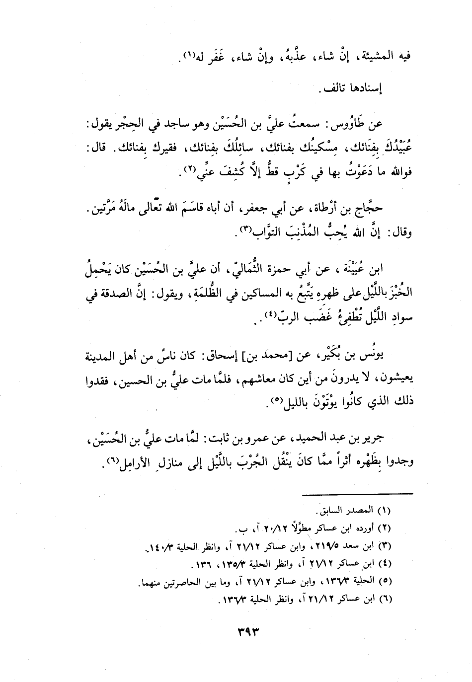 أَنَّ عَلِيَّ بنَ الحُسَيْنِ كَانَ يَحْمِلُ الخُبْزَ بِاللَّيْلِ عَلَى ظَهْرِهِ، يَتْبَعُ بِهِ المَسَاكِيْنَ فِي الظُّلْمَةِ، وَيَقُوْلُ: إِنَّ الصَّدَقَةَ فِي سَوَادِ اللَّيْلِ تُطْفِئُ غَضَبَ الرَّبِّ (4) .