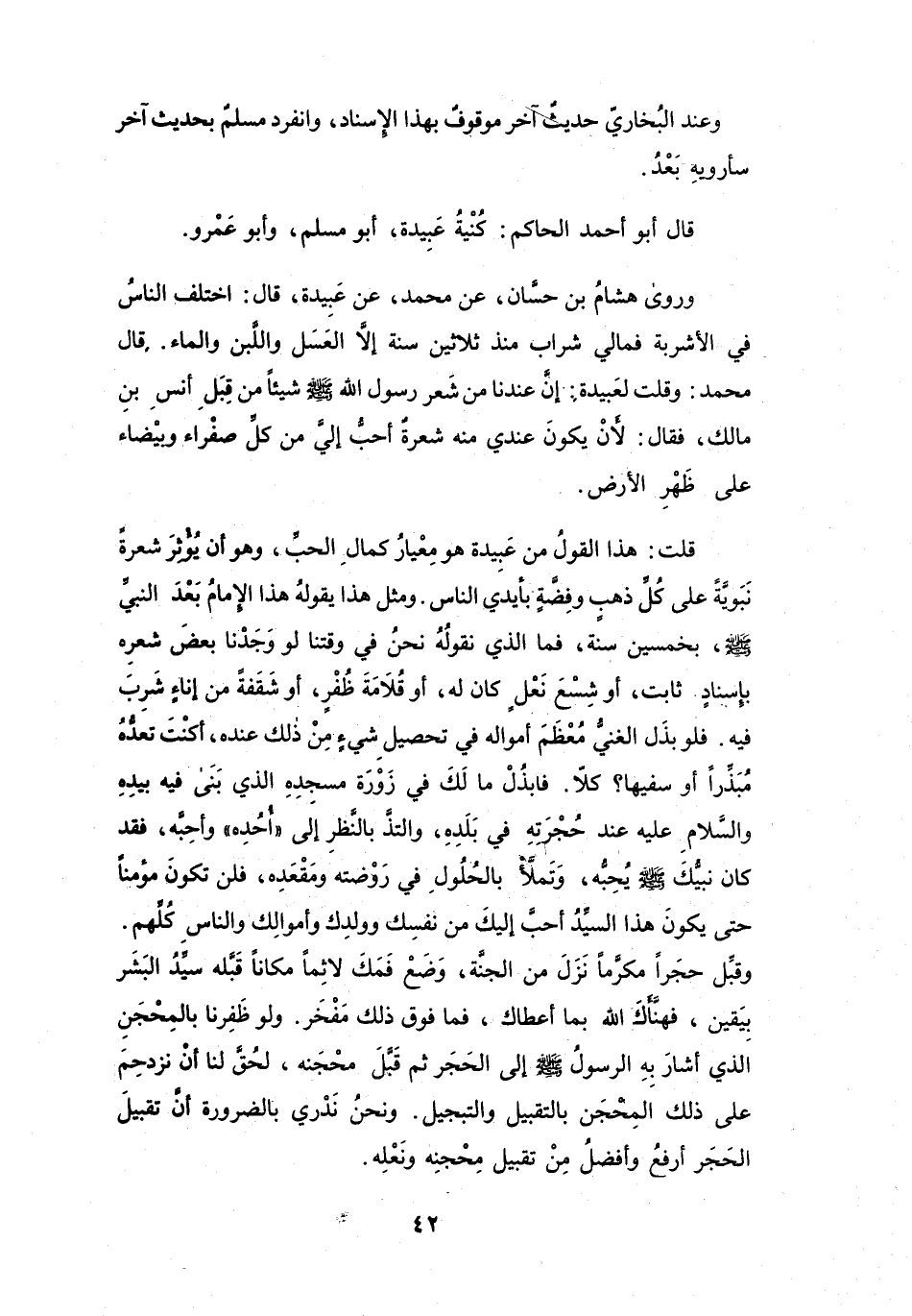 قُلْتُ: هَذَا القَوْلُ مِنْ عَبِيْدَةَ هُوَ مِعْيَارُ كَمَالِ الحُبِّ، وَهُوَ أَنْ يُؤْثِرَ شَعْرَةً نَبَوِيَّةً عَلَى كُلِّ ذَهَبٍ وَفِضَّةٍ بِأَيْدِي النَّاسِ.
