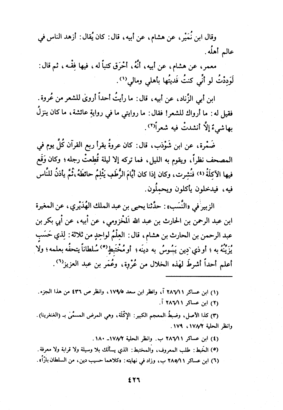 العِلْمُ لِوَاحِدٍ مِنْ ثَلاَثَةٍ: لِذِي حَسَبٍ يُزَيِّنُهُ بِهِ، أَوْ ذِي دِيْنٍ يَسُوْسُ بِهِ دِيْنَهُ، أَوْ مُخْتَبِطٍ (5) سُلْطَاناً يُتْحِفُهُ بِعِلْمِهِ، وَلاَ أَعْلَمُ أَحَداً أَشْرَطَ لِهَذِهِ الخِلاَلِ مِنْ عُرْوَةَ، وَعُمَرَ بنِ عَبْدِ العَزِيْزِ (6) .