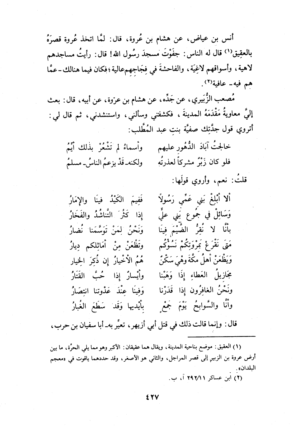 بَعَثَ إِلَيَّ مُعَاوِيَةُ مَقْدَمُهُ المَدِيْنَةَ، فَكَشَفَنِي، وَسَأَلَنِي، وَاسْتَنْشَدَنِي، ثُمَّ قَالَ لِي: أَتَرْوِي قَوْلَ جَدَّتِكَ صَفِيَّةَ بِنْتِ عَبْدِ المُطَّلِبِ: