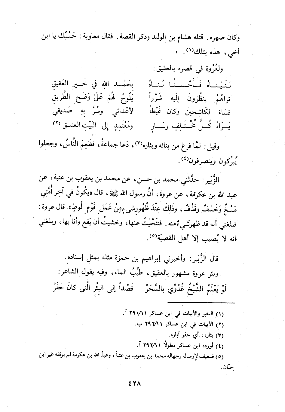 الزُّبَيْرُ: حَدَّثَنِي مُحَمَّدُ بنُ حَسَنٍ، عَنْ مُحَمَّدِ بنِ يَعْقُوْبَ بنِ عُتْبَةَ، عَنْ عَبْدِ اللهِ بنِ عِكْرِمَةَ، عَنْ عُرْوَةَ: