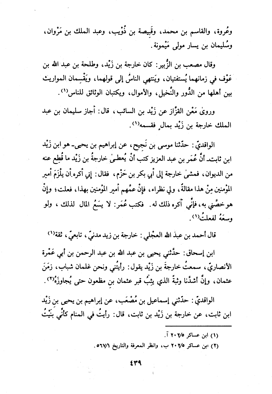 وَقَالَ مُصْعَبُ بنُ الزُّبَيْرِ: كَانَ خَارِجَةُ بنُ زَيْدٍ، وَطَلْحَةُ بنُ عَبْدِ اللهِ بنِ عَوْفٍ فِي زَمَانِهِمَا يُسْتَفْتَيَانِ، وَيَنْتَهِي النَّاسُ إِلَى قَوْلِهِمَا، وَيَقْسِمَانِ المَوَارِيْثَ بَيْنَ أَهْلِهَا مِنَ الدُّوْرِ، وَالنَّخِيْلِ، وَالأَمْوَالِ، وَيَكْتُبَانِ الوَثَائِقَ لِلنَّاسِ (1) .