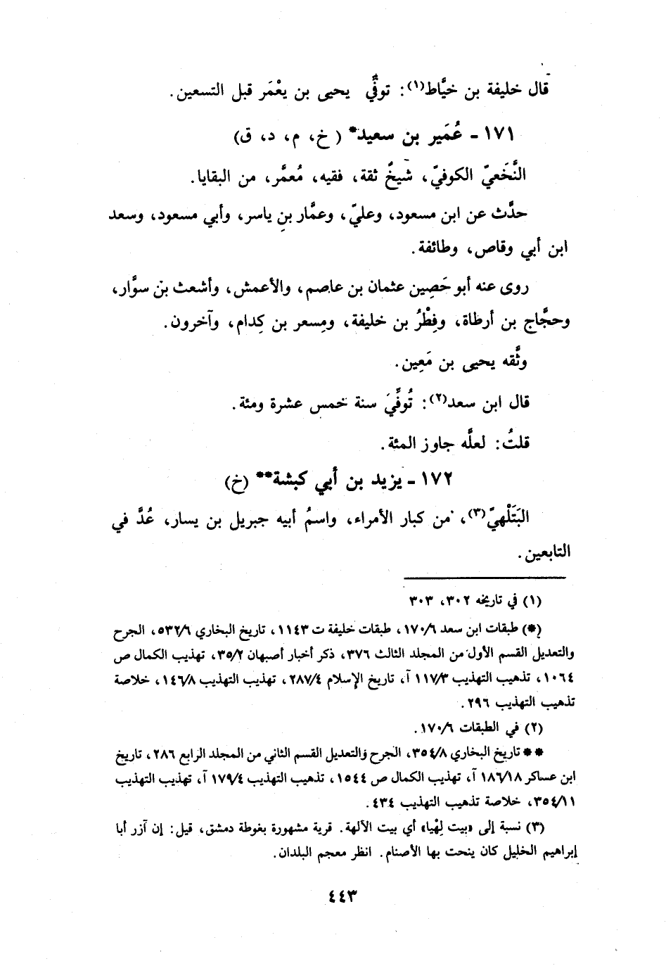 1) في تاريخه 302، 303 (*) طبقات ابن سعد 6 / 170، طبقات خليفة ت 1143، تاريخ البخاري 6 / 532، الجرح والتعديل القسم الأول من المجلد الثالث 376، ذكر أخبار أصبهان 2 / 35، تهذيب الكمال ص 1064، تذهيب التهذيب 3 / 117 آ، تاريخ الإسلام 4 / 287، تهذيب التهذيب 8 / 146، خلاصة تذهيب التهذيب 296.
