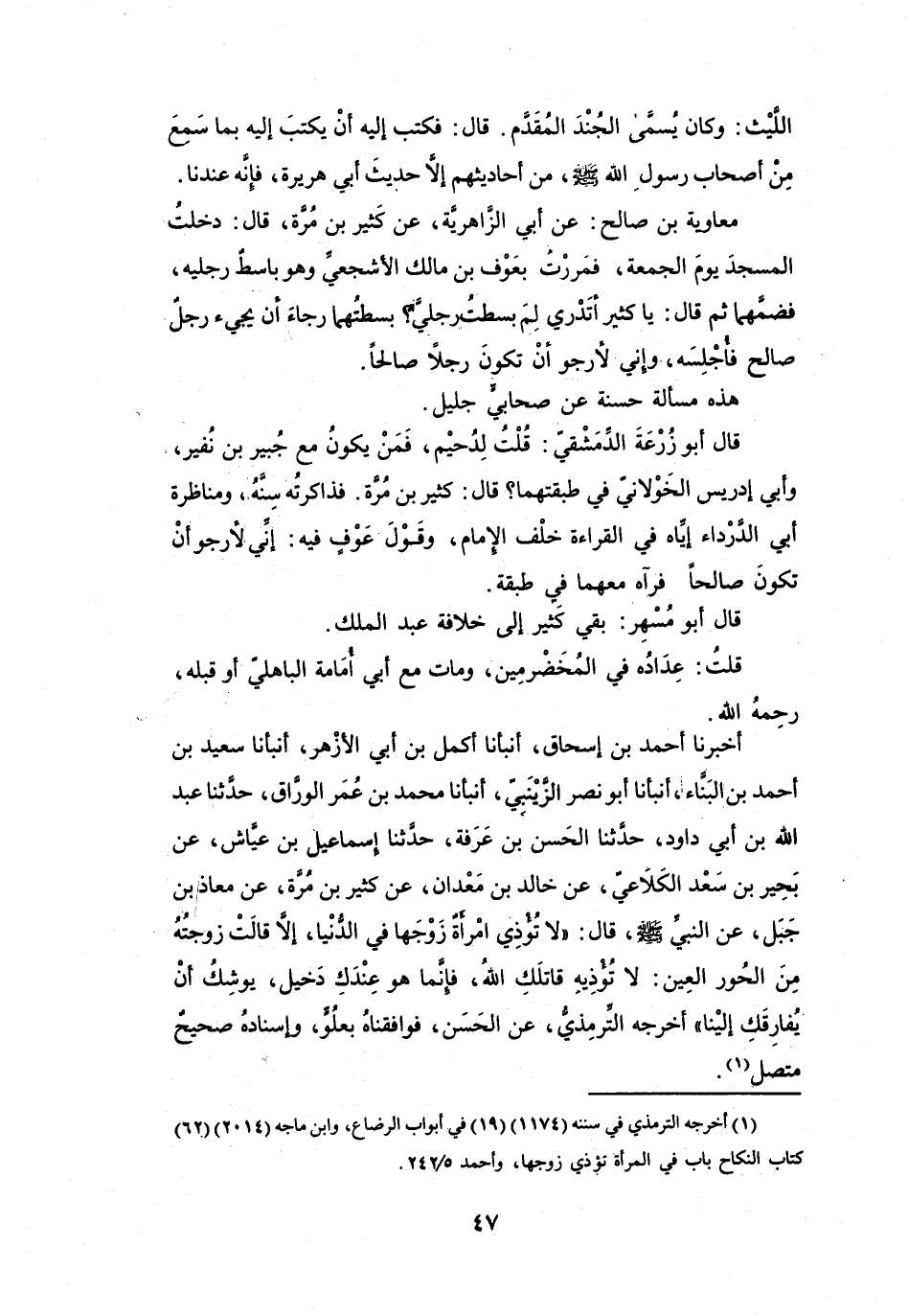 مُعَاوِيَةُ بنُ صَالِحٍ: عَنْ أَبِي الزَّاهِرِيَّةِ، عَنْ كَثِيْرِ بنِ مُرَّةَ، قَالَ: