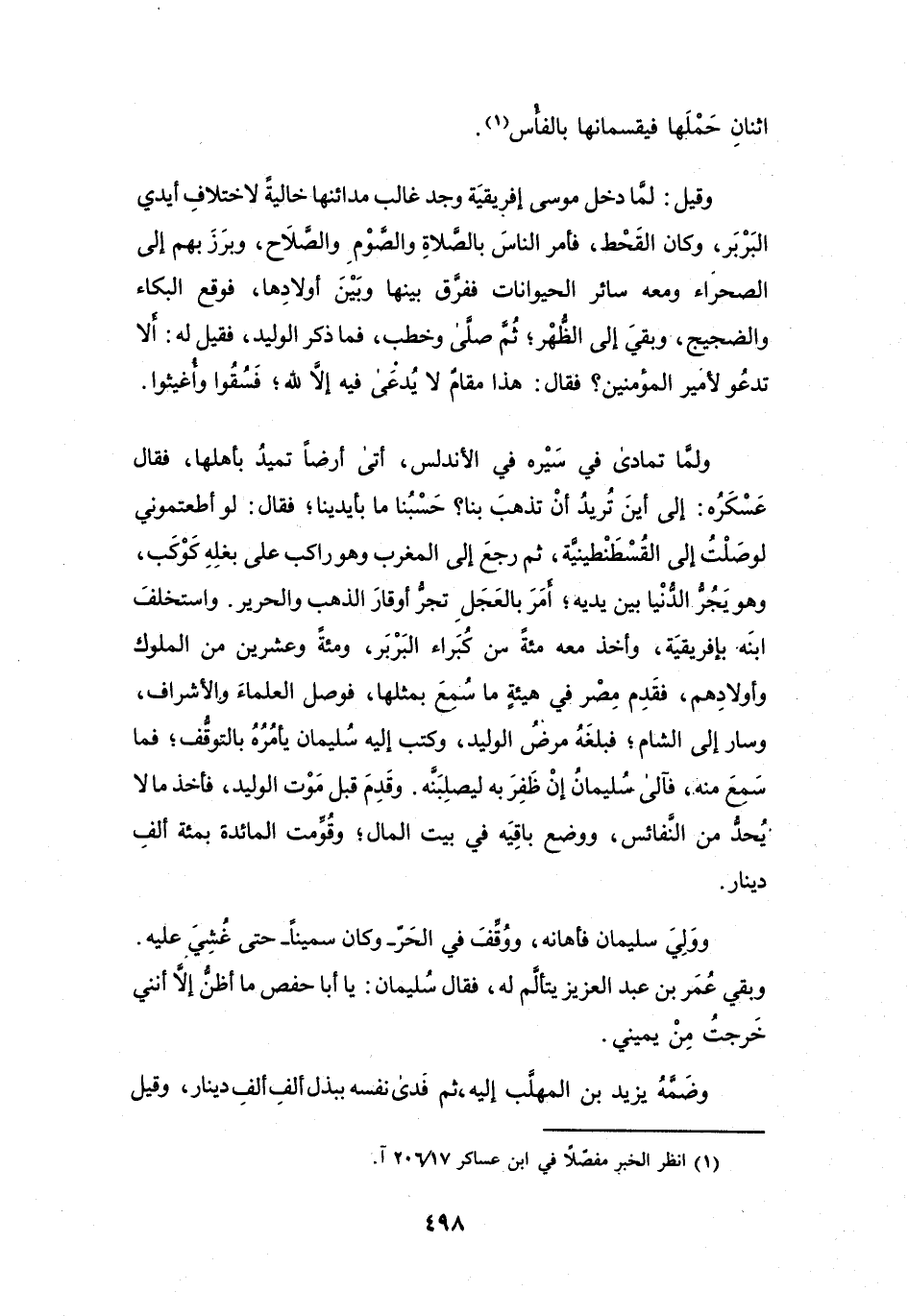 ثُمَّ رَجَعَ إِلَى المَغْرِبِ وَهُوَ رَاكِبٌ عَلَى بَغْلِهِ كَوْكَبٍ، وَهُوَ يَجُرُّ الدُّنْيَا بَيْنَ يَدَيْهِ، أَمَرَ بِالعَجَلِ تَجُرُّ أَوْقَارَ الذَّهَبِ وَالحَرِيْرِ، وَاسْتَخْلَفَ ابْنَهُ بِإِفْرِيْقِيَةَ، وَأَخَذَ مَعَهُ مائَةً مِنْ كُبَرَاءِ البَرْبَرِ، وَمائَةً وَعِشْرِيْنَ مِنَ المُلُوْكِ وَأَوْلاَدِهِم، فَقَدِمَ مِصْرَ فِي هَيْئَةٍ مَا سُمِعَ بِمِثْلِهَا، فَوَصَلَ العُلَمَاءَ وَالأَشْرَافَ، وَسَارَ إِلَى الشَّامِ، فَبَلَغَهُ مَرَضُ الوَلِيْدِ، وَكَتَبَ إِلَيْهِ سُلَيْمَانُ يَأْمُرُهُ بِالتَّوَقُّفِ، فَمَا سَمِعَ مِنْهُ، فَآلَى سُلَيْمَانُ إِنْ ظَفِرَ بِهِ، لَيَصْلِبَنَّهُ.