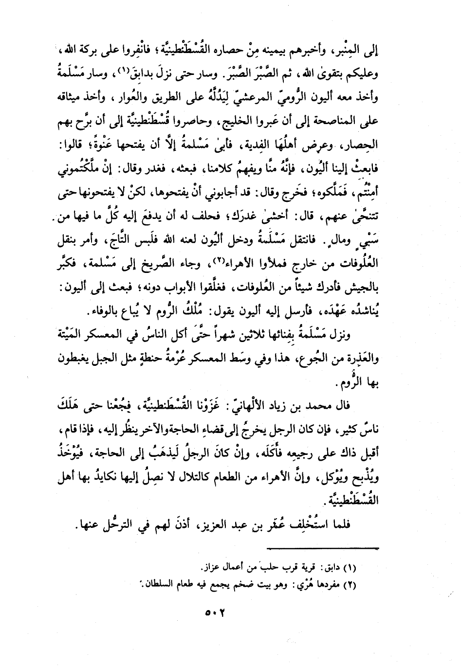 وَسَارَ حَتَّى نَزَلَ بِدَابِقٍ (1) ، وَسَارَ مَسْلَمَةُ، وَأَخَذَ مَعَهُ أَليُوْنَ الرُّوْمِيَّ المَرْعَشِيَّ لِيَدُلَّهُ عَلَى الطَّرِيْقِ وَالعُوَارِ، وَأَخَذَ مِيْثَاقَهُ عَلَى المُنَاصَحَةِ إِلَى أَنْ عَبَرُوا الخَلِيْجَ، وَحَاصَرُوا قُسْطَنْطِيْنِيَّةَ إِلَى أَنْ بَرَّحَ بِهِمُ الحِصَارُ، وَعَرَضَ أَهْلُهَا الفِدْيَةَ، فَأَبَى مَسْلَمَةُ إِلاَّ أَنَّ يَفْتَحَهَا عَنْوَةً.
