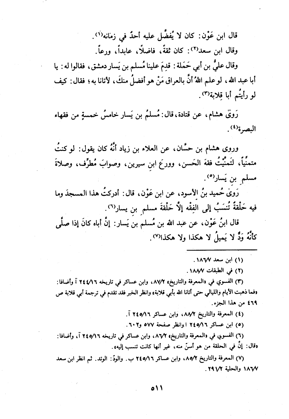 رَوَى: هِشَامٌ، عَنْ قَتَادَةَ، قَالَ: مُسْلِمُ بنُ يَسَارٍ خَامِسُ خَمْسَةٍ مِنْ فُقَهَاءِ البَصْرَةِ (4) .