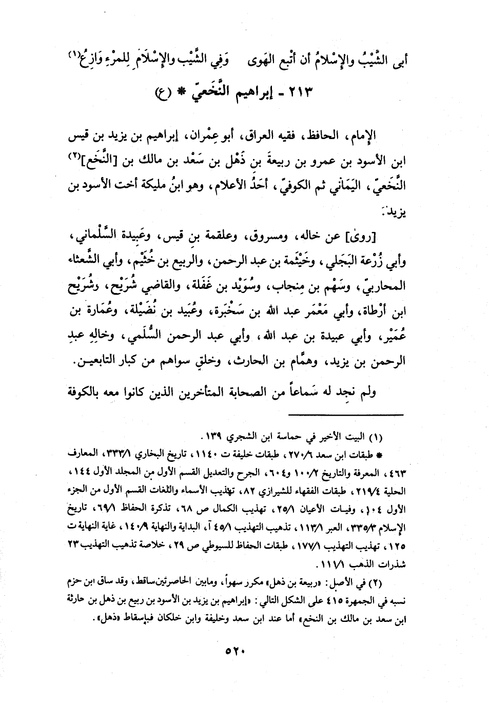 (2) في الأصل: " ربيعة بن ذهل " مكرر سهوا، وما بين الحاصرتين ساقط، وقد ساق ابن حزم نسبه في الجمهرة 415 على الشكل التالي: " إبراهيم بن يزيد بن الأسود بن ربيع بن ذهل بن حارثة ابن سعد بن مالك بن النخع " أما عند ابن سعد وخليفة وابن خلكان فبإسقاط " ذهل ".