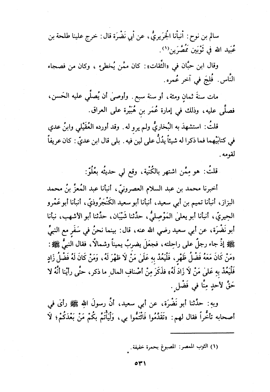 خَرَجَ عَلَيْنَا طَلْحَةُ بنُ عُبَيْدِ اللهِ فِي ثَوْبَيْنِ مُمَصَّرَيْنِ (1) .