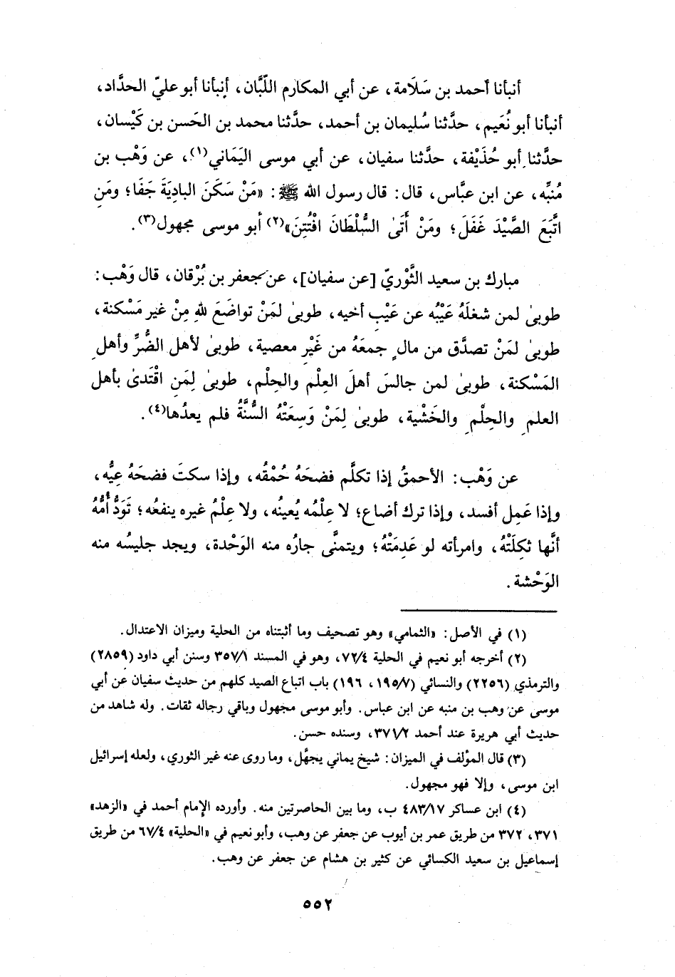 (2) أخرجه أبو نعيم في الحلية 4 / 72، وهو في المسند 1 / 357 وسنن أبي داود (2859) والترمذي (2256) والنسائي (7 / 195، 196) باب اتباع الصيد كلهم من حديث سفيان عن أبي موسى عن وهب بن منبه عن ابن عباس.