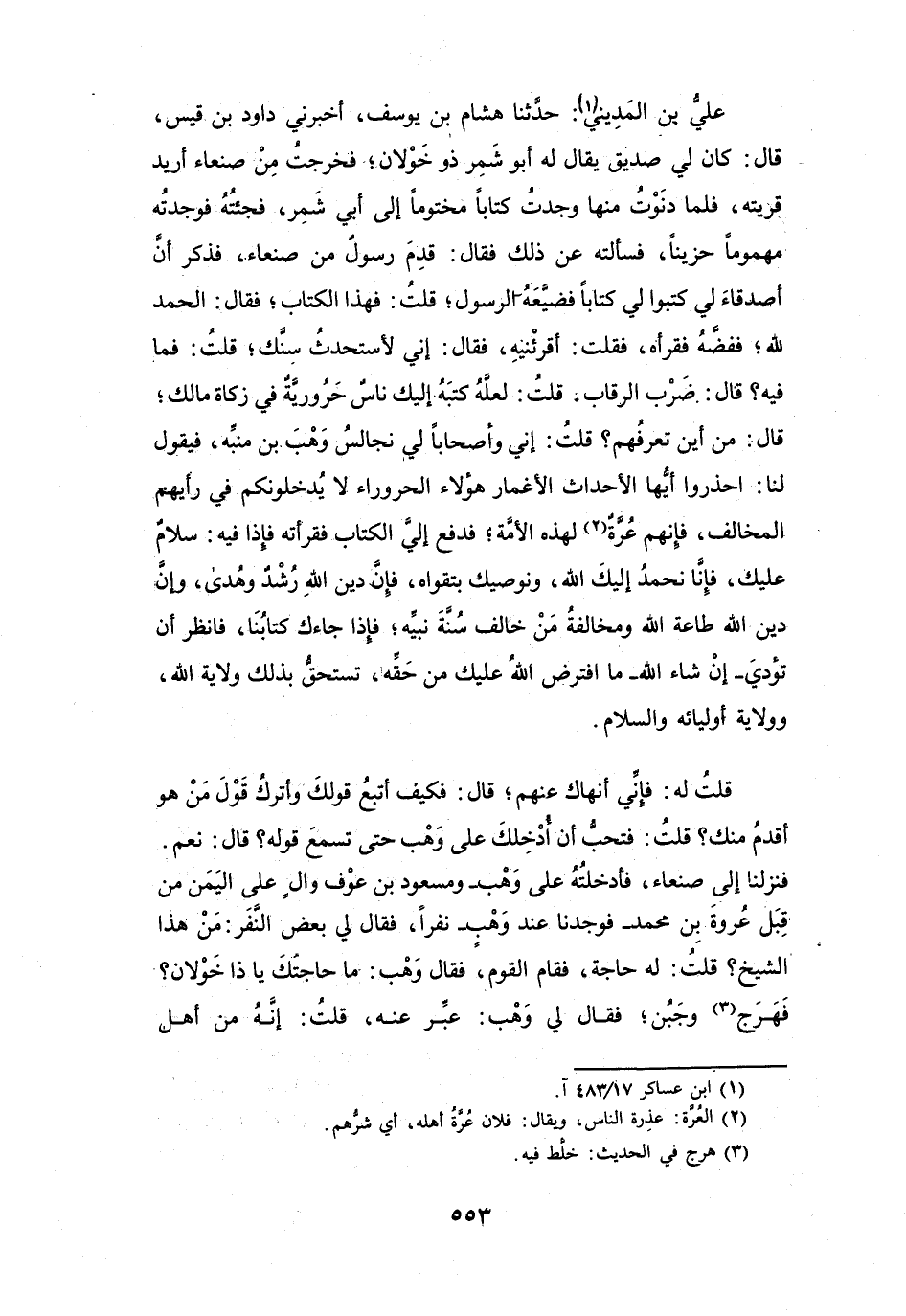 قُلْتُ: إِنِّي وَأَصْحَاباً لِي نُجَالِسُ وَهْبَ بنَ مُنَبِّهٍ، فَيَقُوْلُ لَنَا: احْذَرُوا أَيُّهَا الأَحْدَاثُ الأَغْمَارُ هَؤُلاَءِ الحَرُوْرَاءَ، لاَ يُدْخِلُوْنَكُم فِي رَأْيِهِم المُخَالِفِ، فَإِنَّهُم عُرَّةٌ (2) لِهَذِهِ الأُمَّةِ.