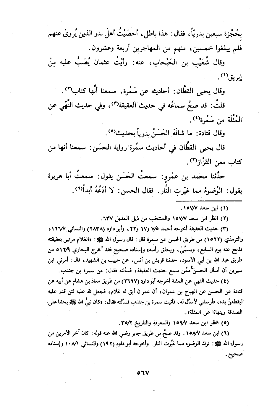 (6) ابن سعد 7 / 158. وقد صح من طريق جابر رضي الله عنه قوله: كان آخر الأمرين من رسول الله صلى الله عليه وسلم: ترك الوضوء مما غيرت النار. وأخرجه أبو داود (192) والنسائي 1 / 108 وإسناده صحيح.