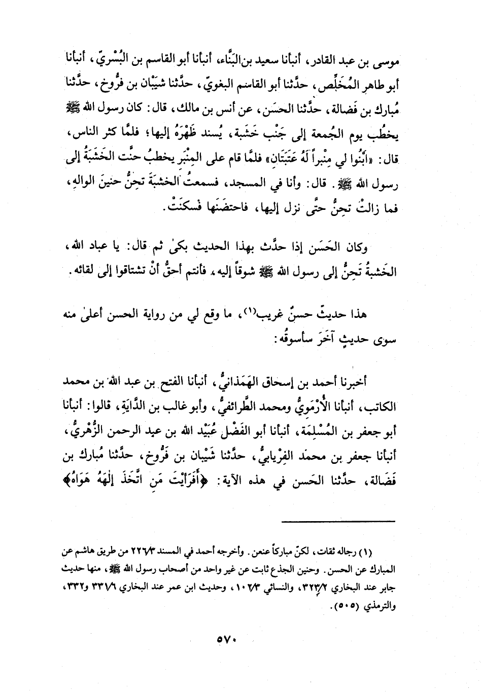 وَكَانَ الحَسَنُ إِذَا حَدَّثَ بِهَذَا الحَدِيْثِ، بَكَى، ثُمَّ قَالَ: يَا عِبَادَ اللهِ، الخَشَبَةُ تَحِنُّ إِلَى رَسُوْلِ اللهِ -صَلَّى اللَّهُ عَلَيْهِ وَسَلَّمَ- شَوْقاً إِلَيْهِ، فَأَنْتُم أَحَقُّ أَنْ تَشْتَاقُوا إِلَى لِقَائِهِ.