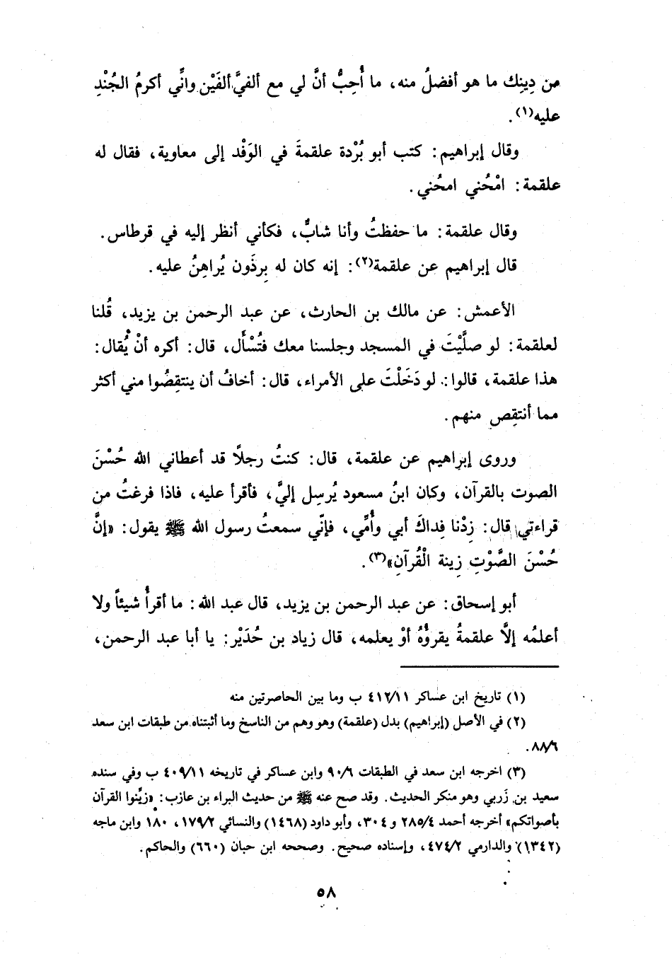 (2) في الأصل (إبراهيم) بدل (علقمة) وهو وهم من الناسخ وما أثبتناه من طبقات ابن سعد 6 / 88.