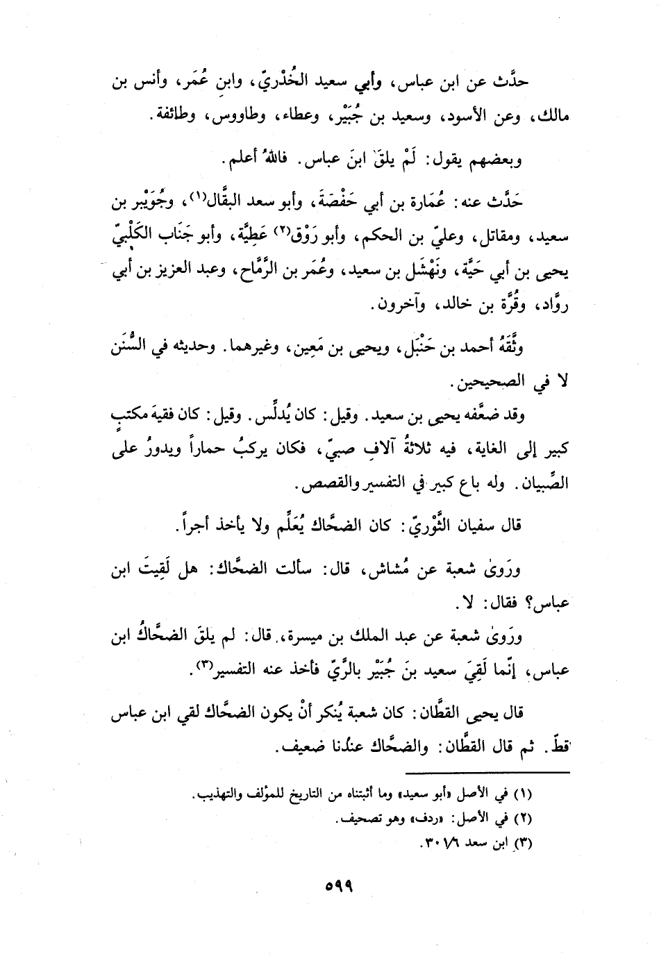 لَمْ يَلْقَ الضَّحَّاكُ ابْنَ عَبَّاسٍ، إِنَّمَا لَقِيَ سَعِيْدَ بنَ جُبَيْرٍ بِالرَّيِّ، فَأَخَذَ عَنْهُ التَّفْسِيْرَ (3) .