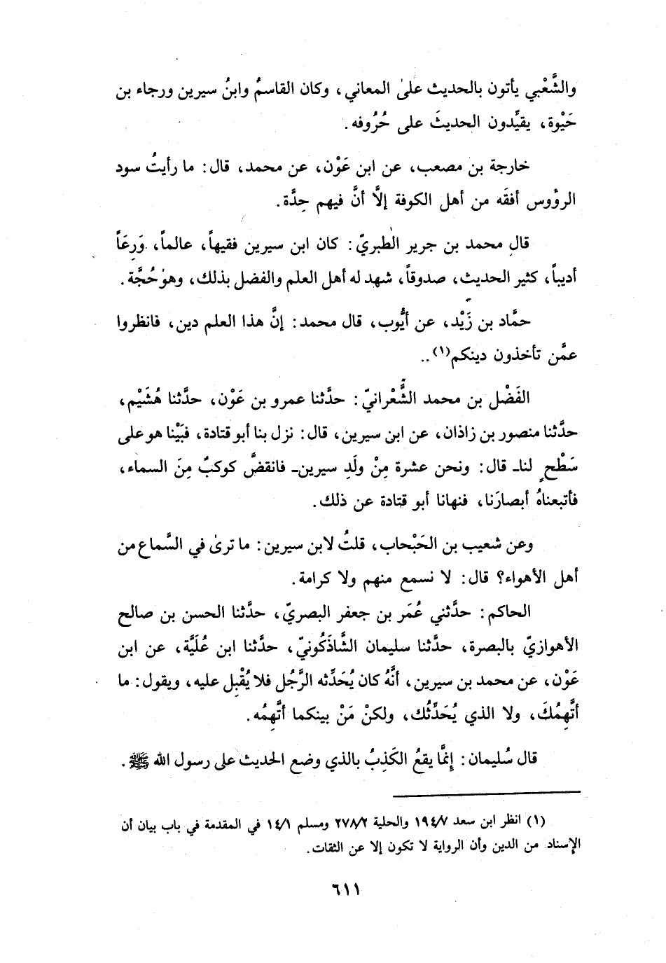 (1) انظر ابن سعد 7 / 194 والحلية 2 / 278 ومسلم 1 / 14 في المقدمة في باب بيان أن الإسناد من الدين وأن الرواية لا تكون إلا عن الثقات.