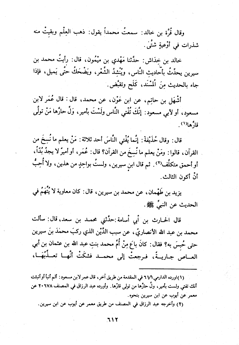 (1) اورده الدارمي 1 / 61 في المقدمة من طريق آخر، قال عمر لابن مسعود: ألم أنبأ أو أنبئت أنك تفتي ولست بأمير، ول حارها من تولى قارها. وأورده عبد الرزاق في المصنف 20678 عن معمر عن أيوب عن ابن سيرين بنحوه.