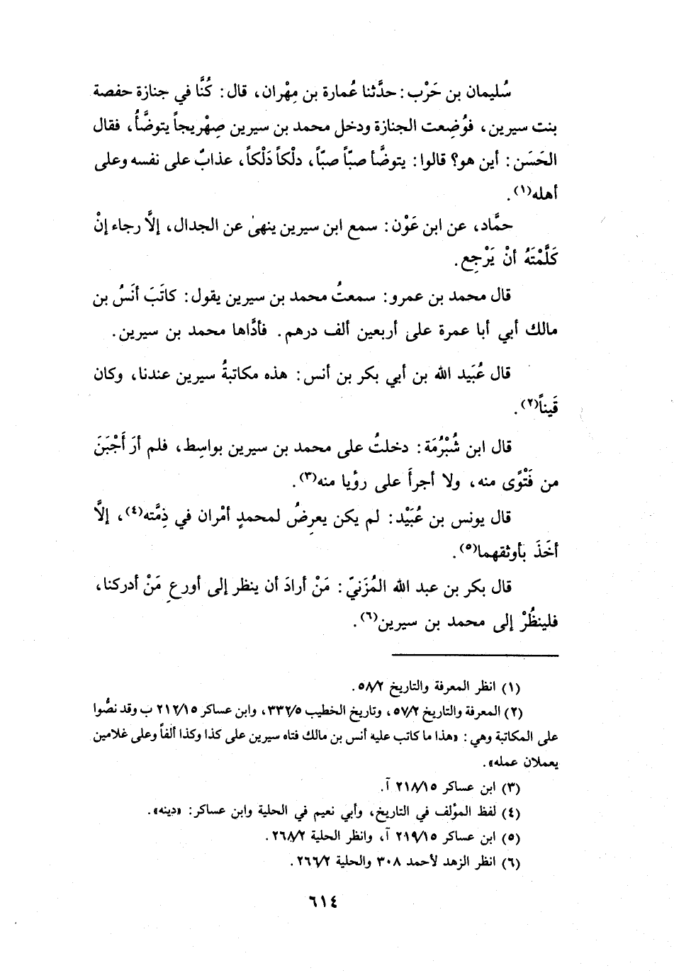 (2) المعرفة والتاريخ 2 / 57، وتاريخ الخطيب 5 / 332، وابن عساكر 15 / 212 ب وقد نصوا على المكاتبة وهي: " هذا ما كاتب عليه أنس بن مالك فتاه سيرين على كذا وكذا ألفا وعلى غلامين يعملان عمله ".