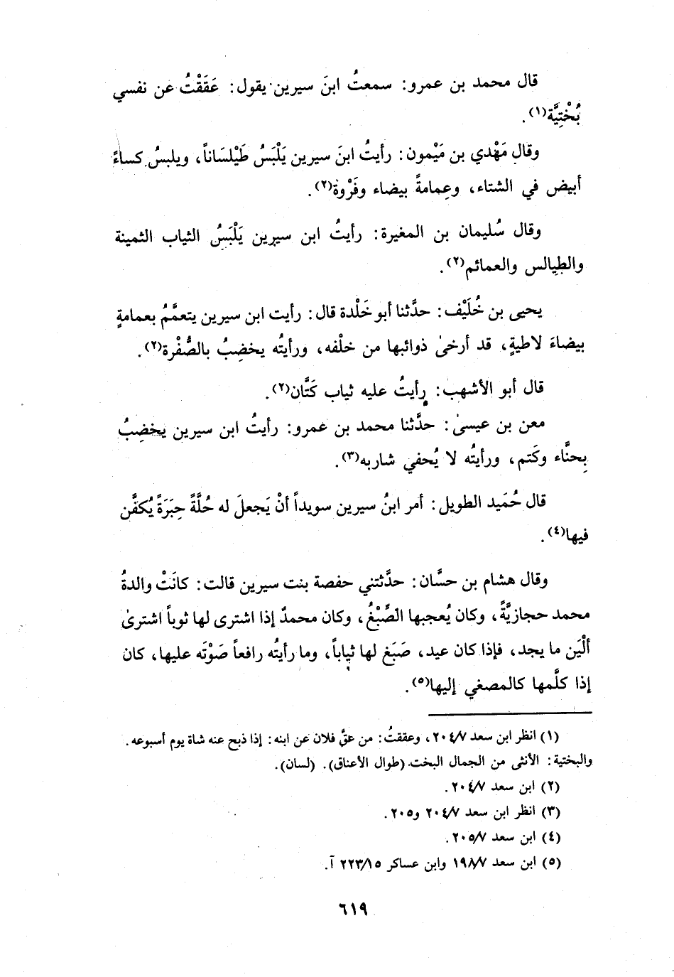 رَأَيْتُ ابْنَ سِيْرِيْنَ يَتَعَمَّمُ بِعِمَامَةٍ بَيْضَاءَ لاَطِيَةٍ، قَدْ أَرْخَى ذَوَائِبَهَا مِنْ خَلْفِهِ، وَرَأَيْتُهُ يَخْضِبُ بِالصُّفْرَةِ (2) .