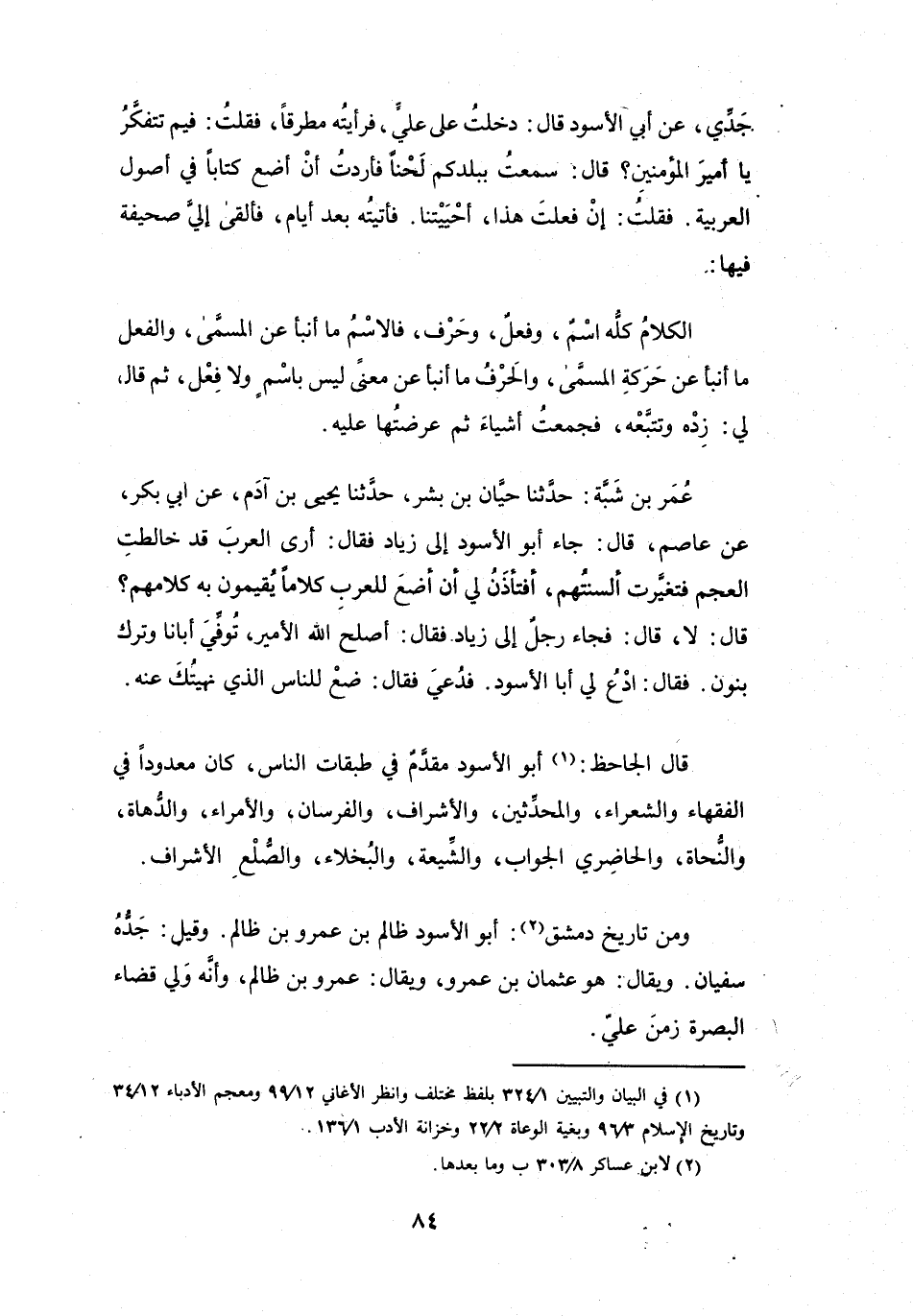 جَاءَ أَبُو الأَسْوَدِ إِلَى زِيَادٍ، فَقَالَ: أَرَى العَرَبَ قَدْ خَالَطَتِ العَجَمَ، فَتَغَيَّرَتْ أَلْسِنَتُهُم، أَفَتَأْذَنُ لِي أَنْ أَضَعَ لِلْعَرَبِ كَلاَماً يُقِيْمُوْنَ بِهِ كَلاَمَهُم؟